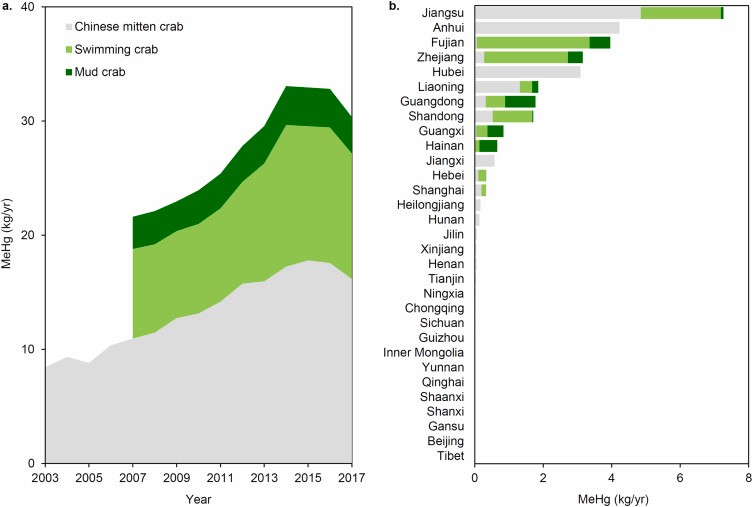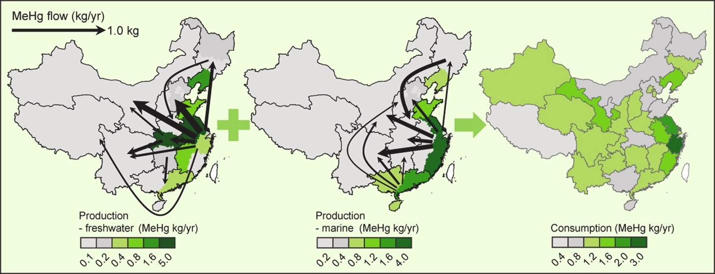 甲基汞(Methylmercury, MeHg)作为自然界中汞元素的常见存在形式之一,是一种生物毒性物质,对于人体具有极高的神经毒性,发育期婴幼儿及孕期妇女为其主要敏感人群。甲基汞常见于水体及生物体中,通过食物摄入少量即能发挥巨大毒性,食物摄入也是甲基汞暴露的主要渠道。近年来,人体甲基汞暴露研究主要集中在海水鱼类如金枪鱼等高甲基汞浓度生物及东亚地区大米等低甲基汞浓度、高摄入量的食物种类之中,对于其他食物种类的甲基汞含量及人体暴露贡献的研究较为匮乏。本研究以中国产蟹类为切入点,定量地研究了国产蟹类甲基汞的年总产量、迁移途径及最终对于人体甲基汞暴露的贡献(图1)。