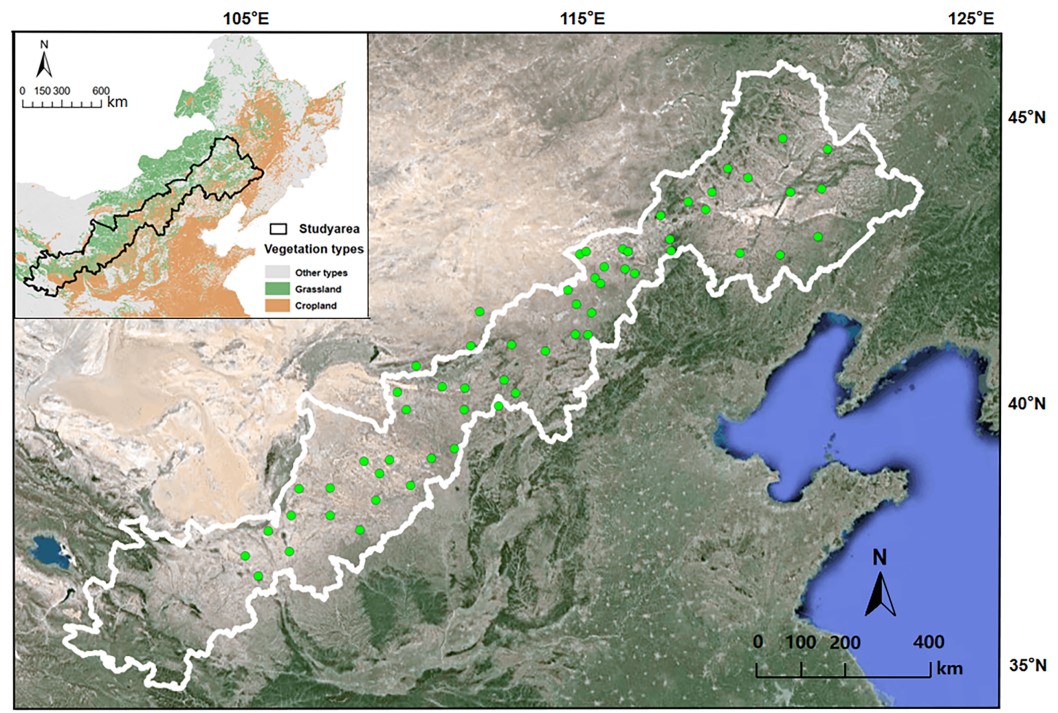 (主图绿点为采样点位置,次图显示了中国北方农牧交错带的位置和交错带内的植被类型)