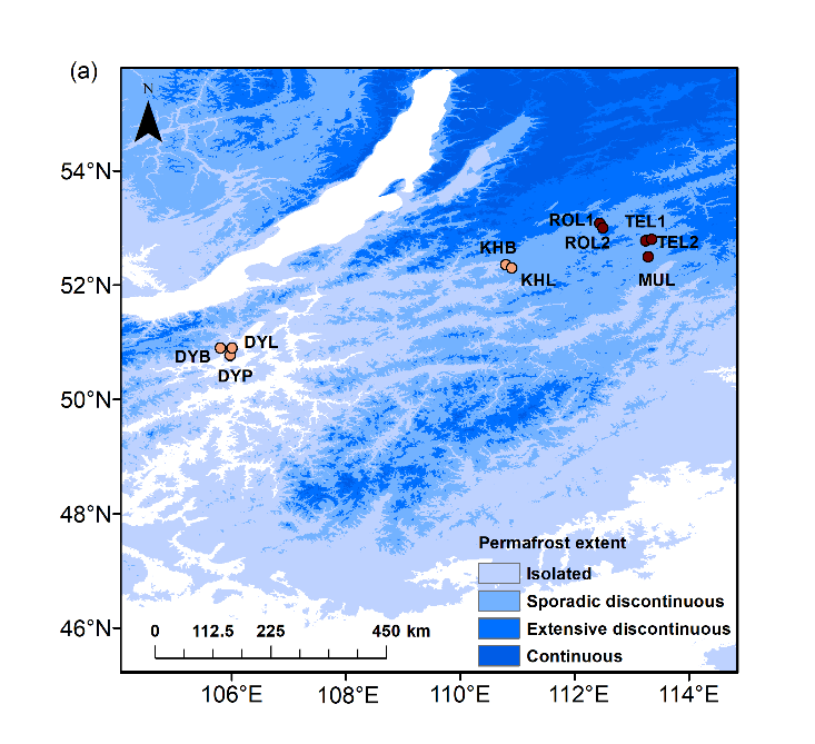 生长在多年冻土层南缘的半北方森林和北方森林易受气候变暖的影响。然而,气候变暖如何威胁分布在多年冻土上的优势树种的生长仍有待确定,特别是在变暖引起的多年冻土退化的同步过程中。西伯利亚南部多年冻土区的树木生长对气温升高和变暖引起的多年冻土区退化高度敏感。本研究在10个北方森林样地对535株优势种落叶松(包括兴安落叶松Larix gmelinii和西伯利亚落叶松L. sibirica)和白桦(Betula platyphylla)的树轮宽度进行了研究。比较了位于两个多年冻土区的样地树木年轮基面积指数(BAI)与气温、降水和帕尔默干旱程度指数(PDSI)的关系。结果表明,气候变暖导致的冻土退化通过增加根层额外的水分来源来影响树木径向生长。