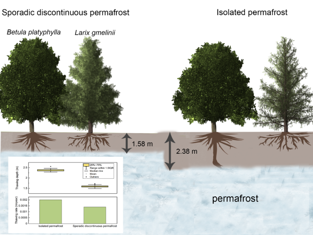 本研究以西伯利亚西伯利亚南部多年冻土区南缘北方森林为研究对象,分析了白桦和落叶松的径向生长及其与气候因子的关系。研究结果表明,在气候变暖的背景下,多年冻土活动层垂直深度的变化改变了不同根系深度的木本植物的根系环境,显着影响了树木的生长以及生长与气候的关系。在未来持续变暖的背景下,永久冻土的融化可能导致新的稳定状态,导致针叶林逐渐演化为阔叶林。本研究为树木生长对气候变暖和多年冻土退化的适应机制提供了证据,未来有必要监测永久冻土活动层厚度的变化,以更好地预测森林动态。