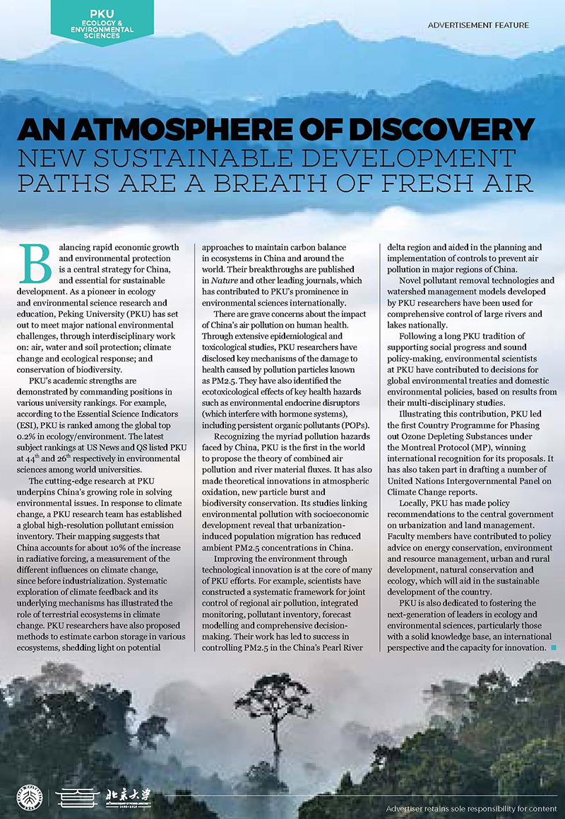为迎接北京大学120周年校庆,NATURE主刊近期推出了一版专门针对香港六合彩开奖直播 学院和环境工程学院的“生态环境”宣传页,标题为:AN ATMOSPHERE OF DISCOVERY:NEW SUSTAINABLE DEVELOPMENT PATHS ARE A BREATH OF FRESH AIR。