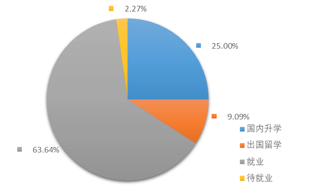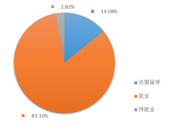 2017年,我院硕士毕业生共71人,其中出国留学10人,所占比例为14.08%,签就业协议59人,所占比例为83.10%,待就业2人,所占比例为2.82%。