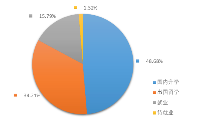 2017年,我院本科毕业生共计划本科毕业生共计76人,其中国内升学37人,占比48.68%,出国留学26人,所占比例为34.21%,签定就业协议和灵活就业共12人,占比之和为15.79%,另有1位毕业生待就业。