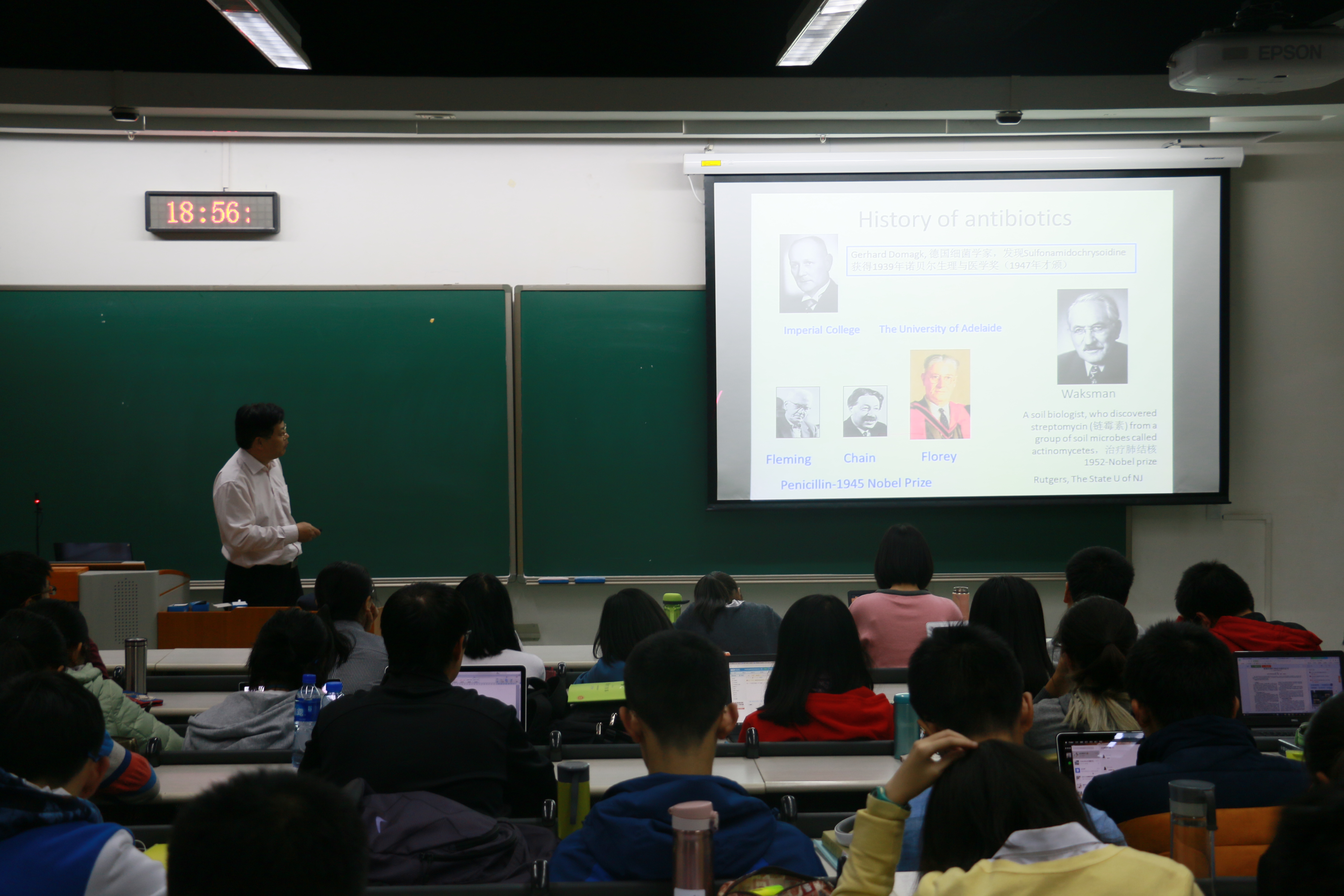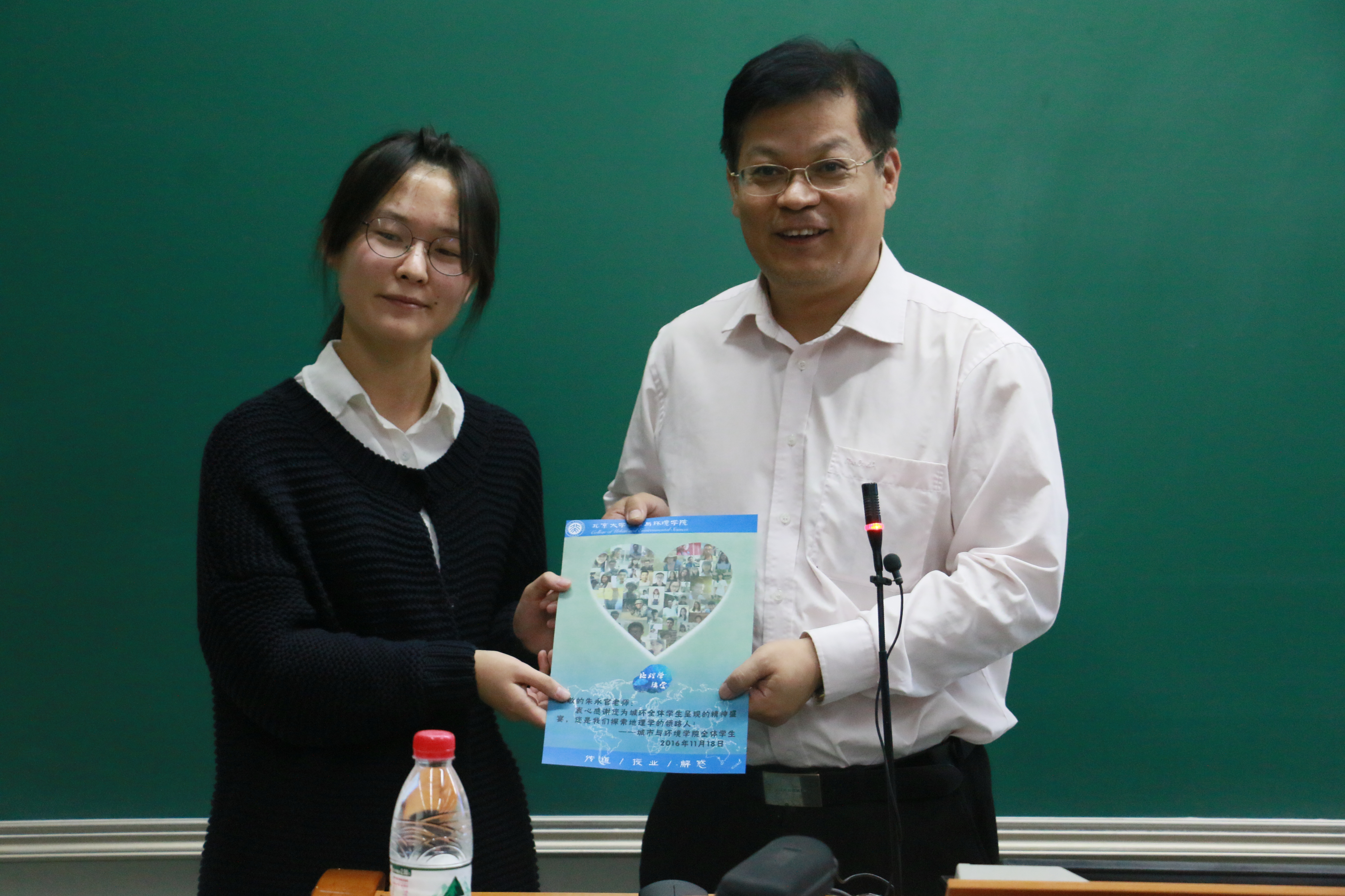 副院长李本纲教授担任主持人。 朱永官研究员用三位与抗生素研究有关的诺贝尔奖得主的故事来引出抗生素的历史,从中我们可以看到抗生素的发展历史非常短暂——它在20世纪初才开始被发现。而在这短短一百年的时间里,抗生素却已成为现代医学不可或缺的主流医疗手段,足见其功能之强大。 图一 讲座现场 但万事有利必有弊。朱老师接下来便向同学们说明了抗生素巨大的危害性。它会使细菌产生抗性,抗生素使用得越多细菌对其抵抗能力就越强。它们在不断进化,越来越顽强,最后结果是少有抗生素能杀灭它们。令人担忧的是,目前抗生素的滥用现象非常严重,这只会导致抗性微生物越来越多,其抗性越来越强,最后会产生“超级细菌”,它们将对大部分抗生素都有强大的耐药性。人类一旦被感染,几乎没有治愈的可能。 朱老师说,我们现在身处“后抗生素”时代,所面临的不仅是化学污染,还有无处不在的抗性微生物污染。2012年,全球由三类主要耐药菌导致的直接经济损失是16亿英镑。解决抗生素危机刻不容缓。朱老师提醒大家,由于抗性微生物进入环境后便很难控制,所以要从养殖场、污水处理厂、医院、生产抗生素药物的厂商等源头消减污染。他以详实的数据与生动的实例向大家展示了如何控制好源头的排放,让同学们获益匪浅。 图二 新生代表赠送纪念品 讲座结束后,同学们踊跃提问,从研究环境抗生素的原因到超级细菌的处理方法,从目标理念到实践方法,朱导师都一一仔细回答,让大家见识了这位学术大家的广博学识与真挚热忱,并深深为之折服。