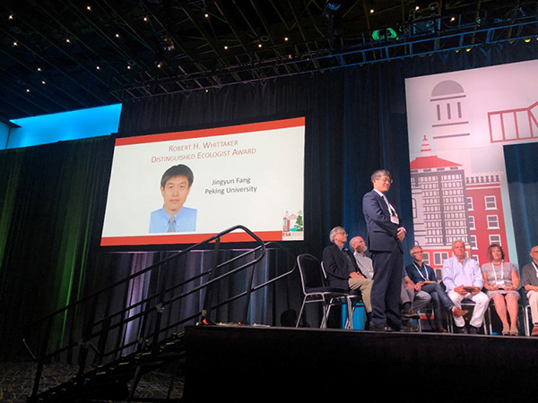 /生态研究中心方精云院士应邀出席并领奖,该奖由美国生态学会主席颁发。 “惠特克杰出生态学家奖”由美国生态学会设立,以纪念享誉世界的杰出生态学家罗伯特·惠特克,授予对生态学作出突出贡献的非美籍生态学家,每年仅有一名生态学家入选,是国际生态学界最具影响的奖项之一。方精云是获得该奖的第一位中国人。 美国生态学会是生态学领域人数最多、国际影响最大的学会。评选委员会认为,方精云的工作“发展了惠特克所开拓的多个概念,建立了许多科学严谨的新标准——这是在惠特克时代无法达到的 (His body of work advances numerous concepts that Whittaker pioneered, and also establishes new standards of scientific rigor that were impossible in Whittaker’s time)”。 新闻链接:Ecological Society of America announces 2019 award recipients //www.esa.org/blog/2019/04/16/ecological-society-of-america-announces-2019-award-recipients-2/ 方精云院士长期从事全球变化生态学、植被生态学与生物多样性,以及生态遥感等方面的研究工作,取得一系列突出成果,先后发表论著420余篇,国际论文250余篇。其中,在Science、Nature和PNAS上发表论文17篇,国内外引用超过3.5万次。他在国内最早系统开展了我国陆地生态系统碳循环的研究,系统研究了中国陆地生态系统的碳储量及变化,构建了中国第一个国家尺度的陆地碳循环框架;发展了大尺度植被动态的研究方法,丰富了区域植被格局和动态变化的理论;系统研究了我国植物多样性大尺度格局及形成机制,丰富和发展了生物多样性的有关理论;较为系统地开展了我国植物化学计量学研究,提出了“限制元素稳定性假说”,纠正了学术界长期以来的认识误区;较为系统评估了我国及世界主要国家的CO2排放趋势, 对气候变化的若干重要理论和实践问题进行了分析,为我国政府应对气候谈判提供了科学依据。 方精云院士在开展生态学基础研究的同时,也非常注重研究和解决国家需求与社会发展中的生态学问题,通过科技政策咨询、参与政府决策、学科建设等方式,在我国气候变化谈判、草原地区可持续发展、生态文明建设、以及科技评级体系建设、生态学科的建设和发展等方面开展了大量工作,先后向中央政府提交咨询报告7份,一些重要咨询和社会服务工作在学界和政界产生了重要影响。