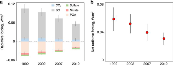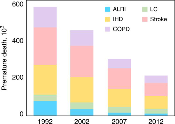 大气污染仍是我国乃至全球都高度关注的环境问题。室内燃煤和生物质等过程由于燃烧效率低,固体燃料消耗量大,从而排放大量的一次细颗粒物(PM2.5)等不完全燃烧污染物。生活污染源是一个不可忽视的大气污染源和呼吸暴露的健康风险源。调查研究指出,虽然随着社会经济的发展,我国居民家庭生活能源,尤其是炊事用能,清洁化转型的趋势明显,但仍有相当一部分家庭在日常生活中使用生物质和煤炭等传统固体燃料(Tao et al., Nature Energy 2018, 3, 567-573)。依托北京大学团队自己建立的全球高分辨大气污染物排放清单,基于最新调查获得农村居民生活能源结构和消耗量数据,研究组系统评估了中国农村生活能源转型带来的环境、健康和气候效应。研究发现,从1992年到2012年的20年间,由于家庭生活能源的清洁转型,农村生活源燃烧排放对大气PM2.5的贡献和人群呼吸暴露浓度的贡献显著地下降。在校正了人口增长、老龄化、自然死亡率变化等因素后,这二十年间因农村生活能源转型使得大气PM2.5暴露导致的过早死亡人数净减少13万。相应地,农村生活源排放的CO2和PM2.5等引起的辐射强迫从1992年的0.057±0.016 W/m2下降至2012年的0.031±0.008 W/m2。生活能源对大气污染、健康危害和气候变化的影响具有很大的时空差异。在北方地区和冬季,受取暖需求等影响,生活能源排放的贡献相对较大。该研究为全面而客观地认识生活能源对大气环境与健康的影响提供了重要的价值。以沈国锋为第一作者,陶澍为通讯作者的研究论文(impacts of air pollutants from rural Chinese households under the rapid residential energy transition)发表在近期《自然∙通讯》(Nature Communication)上。(//www.nature.com/articles/s41467-019-11453-w) 图1. 1992-2012年间农村生活源排放造成的PM2.5暴露引发的过早死亡人数 图2.1992-2012年间农村生活源排放的CO2和主要颗粒态污染物造成的辐射强迫