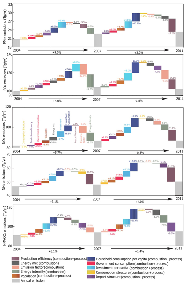 2014级硕博生)分列第一至第三作者,刘峻峰为第一通讯作者。 图1. 2004-2007和2007-2011 两时间段内各类社会环境经济要素对全球工业源一次PM2.5、SO2、NOx、NH3和NMVOC排放变化的贡献。