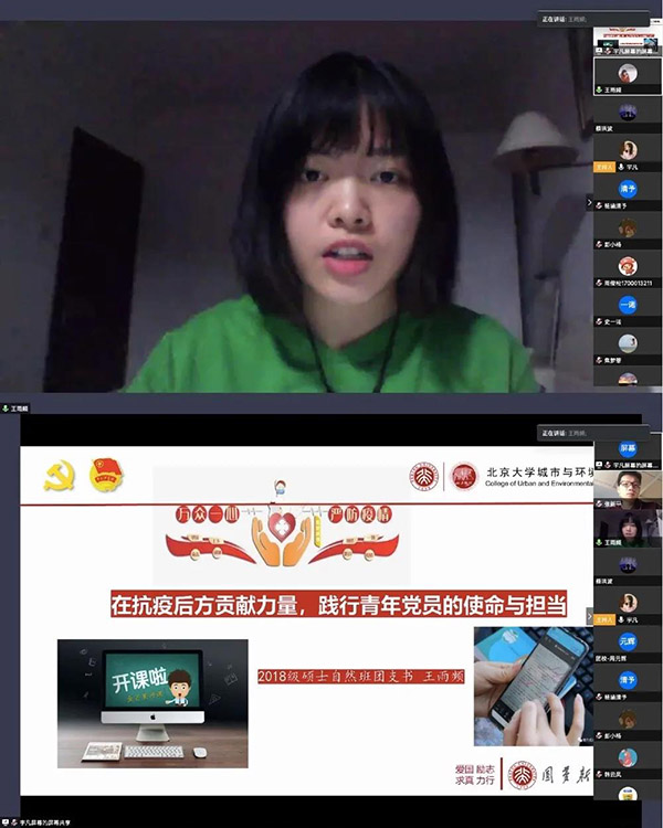 “党-团-班”活力提升计划组织学生党支部、团支部围绕学习总书记回信精神开展了形式多样的线上党团日主题活动。学院全体青年必将牢记嘱托,接过时代的接力棒,珍惜学习时光,练就过硬本领,服务基层,造福群众,为全面打赢防疫攻坚战有一份光、发一份热,为全面建成小康社会、加快建设社会主义现代化国家、实现中华民族伟大复兴的中国梦而奋斗。 转自:北大城环微信公众号
