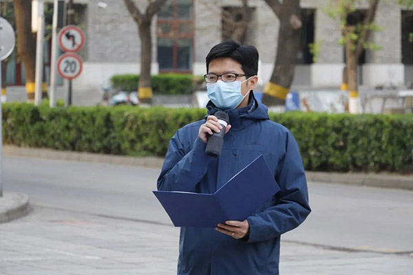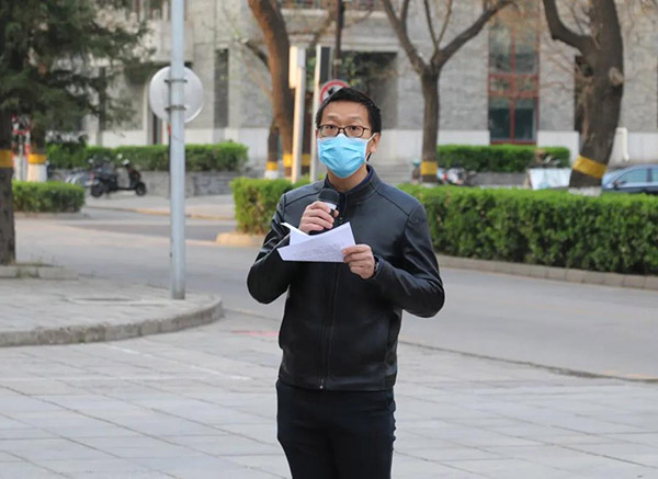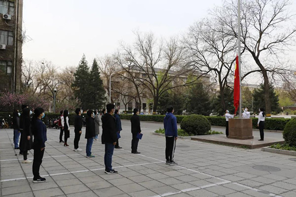 党委副书记张新平、心理与认知科学学院党委副书记李欣,校团委组织部部长叶威惠,张舒、王宇凡、王剑、张璐瑶等学院团委书记、专职辅导员、选留干部,及部分留校学生参加。活动由张舒主持。 7时整,伴随着雄壮的国歌声,鲜艳的五星红旗在师生的注目中冉冉升起。 脚下是土地,头顶是国旗,爱党爱国则是流淌在北大人心中最深沉的力量。张新平带领在场师生重温了习近平总书记给在北京大学首钢医院实习的西藏大学医学院学生的回信和给北京大学援鄂医疗队全体“90后”党员的回信。他勉励大家牢记习总书记的教诲,认真学习贯彻落实回信精神,以援鄂医疗队救死扶伤的崇高精神为榜样,以奉献基层群众的价值追求为信念,不惧风雨、勇挑重担,练就过硬本领、锤炼意志品质,努力让青春在党和人民最需要的地方绽放绚丽之花! 党旗始终飘扬在疫情防控斗争第一线,一大批党员干部冲锋在前,彰显了中国共产党员的担当。李欣带领在场党员重温入党誓词,团员观摩学习。面向党旗的庄严宣誓,是在场师生强化党员意识的实践锻炼,是坚定理想信念的思想淬炼,是牢记初心使命的政治洗礼。 唐平以“向祖国母亲的思想汇报”为题,与大家分享了关于如何做好社会主义祖国建设者和接班人的学习思考体会。他结合对习近平新时代中国特色社会主义思想的学习理解和在北大工作多年收到的熏陶,从“实事求是”和“兼容并包”的历史发展、时代内涵谈起,阐述了要做到实事求是,离不开兼容并包的视野和胸怀,要做好兼容并包,离不开依托实事求是的甄选去抵御精神污染,勉励每位北大辅导员老师都要肩负起使命和责任,让北大同学辩证地理解和践行“实事求是”和“兼容并包”这两个方面,把他们培养成长为社会主义合格的建设者和可靠的接班人。 在学习回信中凝聚信念,在重温誓词中淬炼党性,在思想汇报中坚定道路,主题教育活动至此结束,但爱党爱国的信念却随五星红旗始终飘扬在师生们心中。 转自:北大城环微信公众号