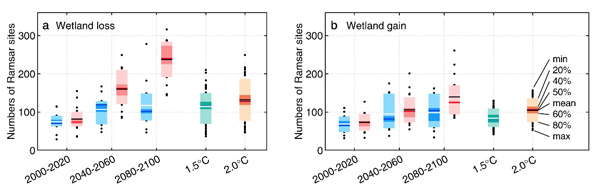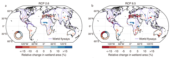 2019级博士生席毅为第一作者,彭书时研究员为通讯作者。本研究受到国家自然科学基金委项目资助。 论文链接://www.nature.com/articles/s41558-020-00942-2 图1. 21世纪面积变化超过10%的Ramsar内陆湿地的数量变化。蓝色表示低排放情景RCP2.6,红色表示高排放情景RCP8.5。 a. 面积损失超过10% 的湿地数量的变化,b. 面积增加超过10% 的湿地数量的变化 图2. RCP2.6与RCP8.5情景下冬季 (12月,1月和2月) Ramsar内陆湿地的面积变化。紫色线条代表全球主要的水鸟迁徙路线。