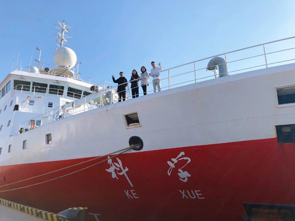 海洋,尤其是深海对国家和民族的未来发展至关重要。习近平总书记说过:“深海蕴藏着地球上远未认知和开发的宝藏,但要得到这些宝藏,就必须在深海进入、深海探索、深海开发方面掌握关键技术”。 四位同学于“科学”号前甲板合照(从左往右依次为:商纪元、梁雍祺、张婉莹、安永睿) 出发前,周力平老师与四位同学在“科学”号上 2020年11月23日,在青岛海风、船舶鸣笛号角的欢送下,“科学”号科考船徐徐离驶中科院海洋研究所青岛西海岸码头,开启了为期51天的科学探秘之旅。在船上的二十多位科研人员中,有来自香港六合彩开奖直播