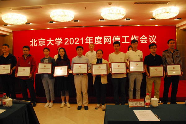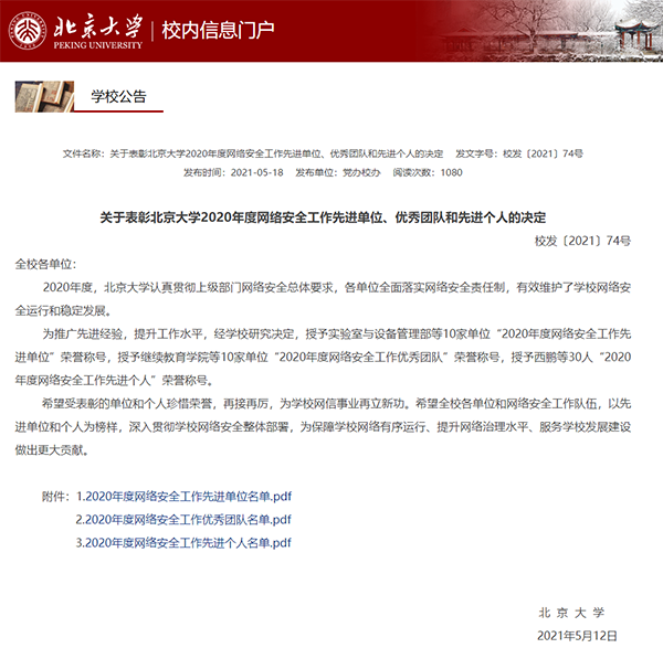 5月17日,北京大学召开2021年度网信工作会议,隆重表彰了2020年度网络安全先进单位、优秀团队和先进个人。我院荣获“2020年度网络安全工作优秀团队”称号,刘雪萍老师被评为“2020年度网络安全工作先进个人”。在表彰大会上,学校网信工作小组组长、党委副书记安钰峰为获奖单位和个人颁发了奖牌和奖状;获奖单位代表进行了经验分享。 2020年,我院网络安全工作团队积极配合学校要求,切实履行网络安全工作的职责。疫情期间,在保障网络安全的前提下,确保了线上研究生复试、研究生答辩工作的顺利开展,并协助全院老师进行在线教学、远程办公等工作,保障全院教学科研工作的顺利进行,圆满完成了年度网络安全工作任务。 为加强认同、凝聚共识、规范管理、提升能力,强化网信工作尤其是网络安全管理的全校统筹,2019年以来,经学校批准,网信办启动了网络安全年度总结暨评优工作,成立了由网信办主任、副主任成员单位(宣传部、保卫部、总务部、计算中心、青年研究中心)组成的评选工作小组,对全校的先进集体和优秀个人进行择优遴选。 本次评选,是对2020年网络安全工作的系统总结,工作小组初评出先进单位10家、优秀团队10家和先进个人30人;初评结果经2021年1月14日学校网信工作小组全体会议审议通过,并公示一周。 5月12日,学校发布《关于表彰北京大学2020年度网络安全工作先进单位、优秀团队和先进个人的决定》(校发〔2021〕74号),对相关单位和个人进行表彰。学校希望受表彰的先进集体、优秀团队和先进个人珍惜荣誉,再接再厉,为学校网信事业再立新功。