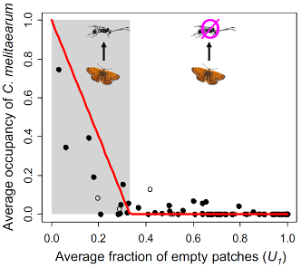 王少鹏研究组基于集合种群理论(metapopulation theory),发展了异质生境中的多物种动态模型,定量预测了食物链中的多样性维持及其对生境破坏的响应。 集合种群理论是种群生态学和传染病学研究的一个经典模型,由著名理论生态学家Richard Levins在1960年代末提出。芬兰生态学家Ilkka Hanski将这一模型扩展至异质生境中,创造性地提出了“集合种群承载力”(metapopulation capacity)概念,将异质景观中的生境复杂性(如生境斑块的面积、空间分布等)简化为一个指标(Hanski & Ovaskainen 2000 Nature)。这一理论被广泛应用于生态保护与管理,但其局限性是只适应用单个物种的种群动态,无法刻画多物种群落。 为此,研究组发展了异质生境中的食物链模型,将集合种群承载力理论推广至多物种群落,定量预测了捕食者-猎物系统的共存条件、以及异质景观所能支撑的最大食物链长度(图1)。模型预测:最大食物链长度随集合种群承载力增加而增加、随捕食者的下行调控(top-down control)增强而降低。这一理论结果将非生物与生物调控作用整合至统一框架下。在特定假定下,该模型给出了一个“经验准则”(rule of thumb):只有当猎物的生境占据比例大于2/3(或空缺比例小于1/3)时,其捕食者才能维持。这一预测得到了芬兰Aland群岛上蝴蝶-寄生蜂系统的验证(图2)。该理论模型为定量预测生境破坏下的生物多样性变化提供了新的工具。 图1. (a)异质生境中的食物链模型:绿色形状表示生境斑块的面积(A_i)和相对距离(d_ij);(b)最大食物链长度的理论预测。其中,集合种群承载力λ表征了生境斑块矩阵(由斑块面积和距离所决定的矩阵)的最大特征值。 图2. 芬兰Aland群岛上寄生蜂(Cotesia melitaearum)的斑块占有比例与宿主蝴蝶的空缺比例的关系。黑色点表示观测数据,红色线表示理论预测。 该研究成果以“Metapopulation capacity determines food chain length in fragmented landscapes”为题,于2021年8月20日在线发表于Proceedings of the National Academy of the Sciences(PNAS)(《美国科学院院刊》)(//doi.org/10.1073/pnas.2102733118)。香港六合彩开奖直播