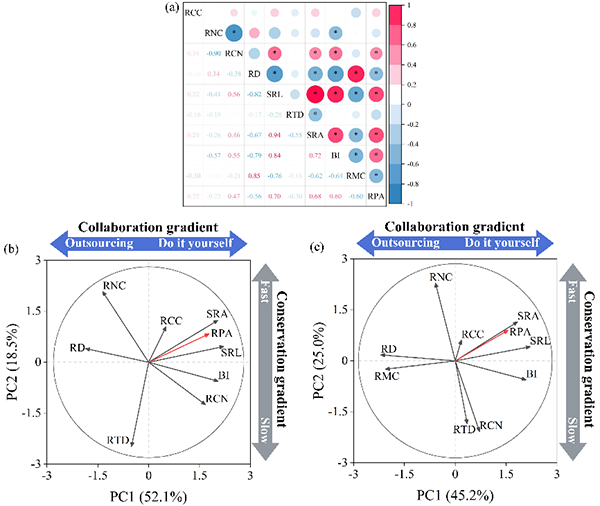 2018级博士生韩孟光为第一作者,朱彪研究员为通讯作者。北京大学博士研究生陈迎,硕士研究生李瑞、于淼和付粱晨,中国林科院高原林业科学研究所李帅锋研究员和苏建荣研究员为合作作者并有重要贡献。感谢云南普洱太阳河省级自然保护区管理局对本研究的支持和帮助。 论文链接://nph.onlinelibrary.wiley.com/doi/abs/10.1111/nph.17906 图1细根性状经济空间(RPA为细根磷酸酶)