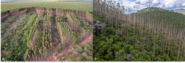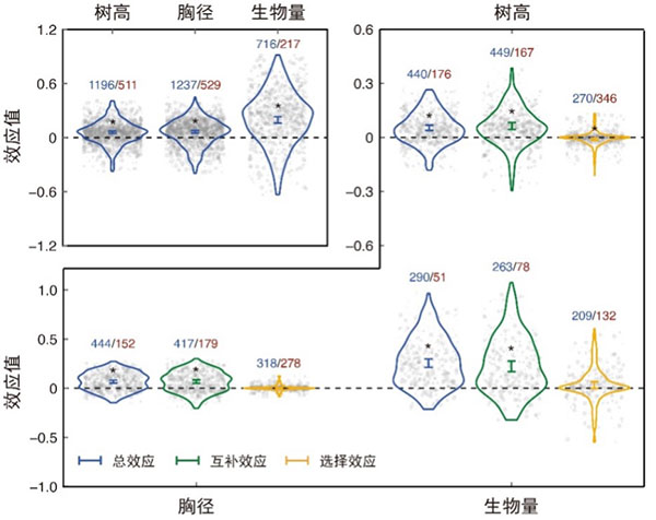 2022年5月20日,《科学》杂志(Science)同期刊发了北京大学生态研究中心华方圆团队和方精云团队的两项重要研究成果,分别以“The biodiversity and ecosystem service contributions and trade-offs of forest restoration approaches”,和“Multispecies forest plantations outyield monocultures across a broad range of conditions”为题发表,揭示了不同森林恢复方式对生物多样性和生态系统服务的影响以及混交林的增产效应。 这两项研究在不同森林恢复模式的生态效益及人工林生态系统功能方面取得重大突破,解决了这两个领域长期悬而未决的理论问题,成果丰富和发展了生物多样性与生态系统功能研究,为森林恢复的政策制定提供了科学支持,也为相关理论在生产实践中的应用搭建了桥梁,具有重要科学和实践意义,受到学术界的高度关注。《科学》杂志同期配发了著名生态学家Jessica Gurevitch教授题为“Managing forests for competing goals”的评述,对两项研究给予了高度评价。 森林恢复方式:天然林与人工林的权衡 华方圆研究员带领保护生态学课题组,牵头7个国家研究人员组成的跨学科团队,汇集、分析了来自全球53个国家地区、264个野外研究近2.6万条数据,回答了何种森林恢复方式能最优地发挥森林的多种生态和生产功能。 长久以来,全球森林恢复多以人工林为主导恢复方式,对天然林恢复的重视不足,两类森林恢复方式在储碳、保土、蓄水、生物多样性保护以及木材生产等生态系统服务方面缺乏系统评估,孰优孰劣,争论不休。针对这一争论,该研究构建了当前最完备的人工林与天然林配对数据集,首次从“多种红利”视角比较了人工林与天然林的生态系统功能,分析了生物多样性与上述生态系统服务在不同森林恢复方式中的协同与权衡关系。结果表明,与结构简单的人工林相比,天然林可以更好地支持生物多样性保护,更好地实现地表碳存储、土壤保持、水源涵养的生态系统服务,但是在木材生产方面却逊色不少。该结果表明,森林恢复需要认真考虑目标与方法,尤其是生产效率与生态效益之间的权衡。文章进一步发现,世界各地许多林龄较老或处于废弃状态、不再用于木材生产的人工林,其生物多样性、地表碳存储、土壤保持、水源涵养成效都低于天然林。考虑到这类人工林的普遍性,将其恢复成天然林将能带来很大的生态红利。 图1:创新性的天然林恢复试点:A-巴西圣保罗州Itatinga圣保罗大学森林实验站的桉树人工林景观中,通过自然恢复、人工辅助的自然恢复、人工种植多样本土植物等方式恢复天然林生态系统;在种植有桉树的实验地,桉树在种植5年后采伐,木材收入可用于帮助承担恢复项目的成本。B-巴西圣保罗州Bertioga对桉树人工林进行改造,用药剂杀死桉树,让本地植物群落自然生长,最终恢复为本地原有的大西洋雨林。(图片来源:Paulo Molin和Pedro Brancalion) 人工造林的抉择:混交林增产效应的启示 人工造林是当前全球森林恢复的主要方式之一。生态学理论和营林实践都表明,相较于单一树种的纯林,多树种的混交林通常能提供更丰富多样的生态系统功能。但混交种植能否促进树木生长和森林生产力始终未能得到科学的解答。方精云-王少鹏团队突破传统野外观测和控制实验研究的局限性,利用人工混交和纯林配对数据,系统分析了人工林生态系统的生产功能及其形成机制。研究团队历时5年,构建了包含255个站点、243个树种、5900余组配对数据的全球混交林实验数据库(Global MixTrees);基于该数据库探究了混交种植对森林生态系统三个主要生长要素(树高、胸径、地上生物量)的影响,以及多种生物因素(物种组成、林龄、种植密度)和非生物因素(温度、降水)对混交效应的调控规律。 图2 混交林在三个生长指标(树高、胸径和生物量)上的混交效应(其中正值表示混交林的生长指标高于纯林) 研究发现,混交林的树高、胸径和生物量均显著高于纯林,平均增加量分别为5.5%、6.8%和25.5%。分析表明,这种增产效果主要由种间互补作用所致(见图2)。进一步分析发现,物种性状组成是影响增产效果的关键因素:不同叶型(针叶和阔叶)混交比单一叶型混交的增产效果更好;不同叶生活史(落叶和常绿)混交比单一生活史混交的增产效果更好;不同养分获取策略(固氮和非固氮)混交与单一养分获取策略混交的增产效果相似。 图3. 混交林的增产效应随林龄、种植密度和温度的变化 研究还发现,混交林的增产效应随着林龄和种植密度的增加呈单峰变化,峰值出现在林龄25年左右和种植密度2500~4100株/公顷之间(图3);气候条件也影响增产效果:高温地区增产效果更明显,但降水变化对增产效果的影响不显著。此外,研究还显示,随着混交物种的增加,增产效应呈现增加趋势。该研究系统阐明了混交种植的增产效应及其机制,在解决森林经营生产中久而未决的理论和实践问题上取得了重大突破,为全球人工造林和经营管理提供了科技支撑。 对森林生态系统保护与恢复的指导意义 联合国已将2021-2030年定为“生态系统恢复的十年”。与应对气候变化的其他努力一起,在这十年中,联合国将推动全球在数百万公顷的土地上开展森林恢复,有望带来巨大的生态和社会红利。但兑现这些红利的前提是:选择合适的森林恢复方式,并确保被恢复的森林生态系统能充分实现预期的生态和社会目标,满足这些前提需要更深入的生态学研究。 北大生态研