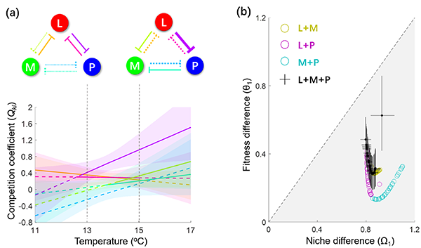 王少鹏研究组与欧美科学家合作,构建了一个破碎化生境下的竞争模型,来理解和预测生境变化对物种共存的影响。该研究推导出了空间显性景观中多个竞争物种共存的判定准则。这一准则为评估气候变化和生境变化下的物种共存和多样性维持提供了新的理论工具。基于这一理论框架,分析了一个水蚤集合群落中的物种共存。该群落包含三种水蚤,生活于波罗的海岛屿的岩池生态系统中,记录了自1980年代以来三种水蚤在500多个岩池中的种群动态(图1)。该研究利用贝叶斯统计学方法拟合了模型参数,揭示了不同水蚤物种的扩散和生存能力与生境斑块大小和空间距离的关系,以及物种间的竞争作用,发现三个物种满足共存准则(图2)。进一步地利用本文提出的共存准则,评估了环境变化对物种共存的可能影响,发现相比于增温,生境恶化(生境斑块的数量和质量下降)将引起物种丧失。 图1. 波罗的海岛屿上的岩池生态系统,其中长期生活着三种水蚤。照片由合作者瑞士巴塞尔大学Dieter Ebert提供。 图2. (a)三种水蚤的种间竞争强度随温度的变化;(b)水蚤群落中物种间的生态位差异和适合度差异(灰色区域表示可共存的参数值)。 香港六合彩开奖直播