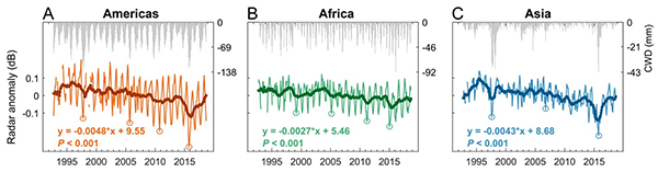 博士研究生罗明宇为论文第一作者,王少鹏研究员为通讯作者,合作者来自美国麻省理工学院、瑞士巴塞尔大学和苏黎世大学。该成果得到了国家自然科学基金委基础科学中心(31988102)和优秀青年基金(32122053)等项目资助。文章链接://www.pnas.org/doi/10.1073/pnas.2201503119 2. 陶胜利研究组开发全新遥感数据揭示热带雨林1992-2018年间的连续干旱响应 在《巴黎协定》等气候政策背景下,全球热带雨林因其巨大的碳储量而备受关注。近几十年来,全球大面积雨林被砍伐。但祸不单行的是,未被砍伐的热带雨林频繁遭遇严重干旱,威胁着雨林的完整性、固碳能力以及生物多样性。 雨林对过去的干旱如何响应?是否能够抵御未来的干旱?以往的研究较多在样地尺度进行,或者通过传统光学遥感数据NDVI等进行研究,缺少长期、连续的观测,因此问题的答案充满争议。 香港六合彩开奖直播