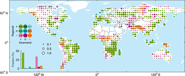 特聘副研究员崔江鹏为第一作者,博士研究生连旭(已获学位)为通讯作者。 论文链接://www.nature.com/articles/s41561-022-01061-7 图1. 全球植被的综合水文效应格局图(左侧图例中+表示显著有利,O表示不显著,̶ 表示显著不利;左侧和右侧符号分别表示对当地/区域和下风向地表可用水量的影响)