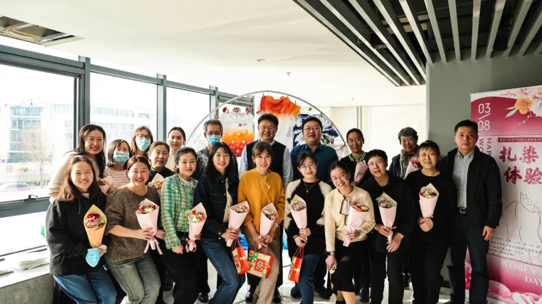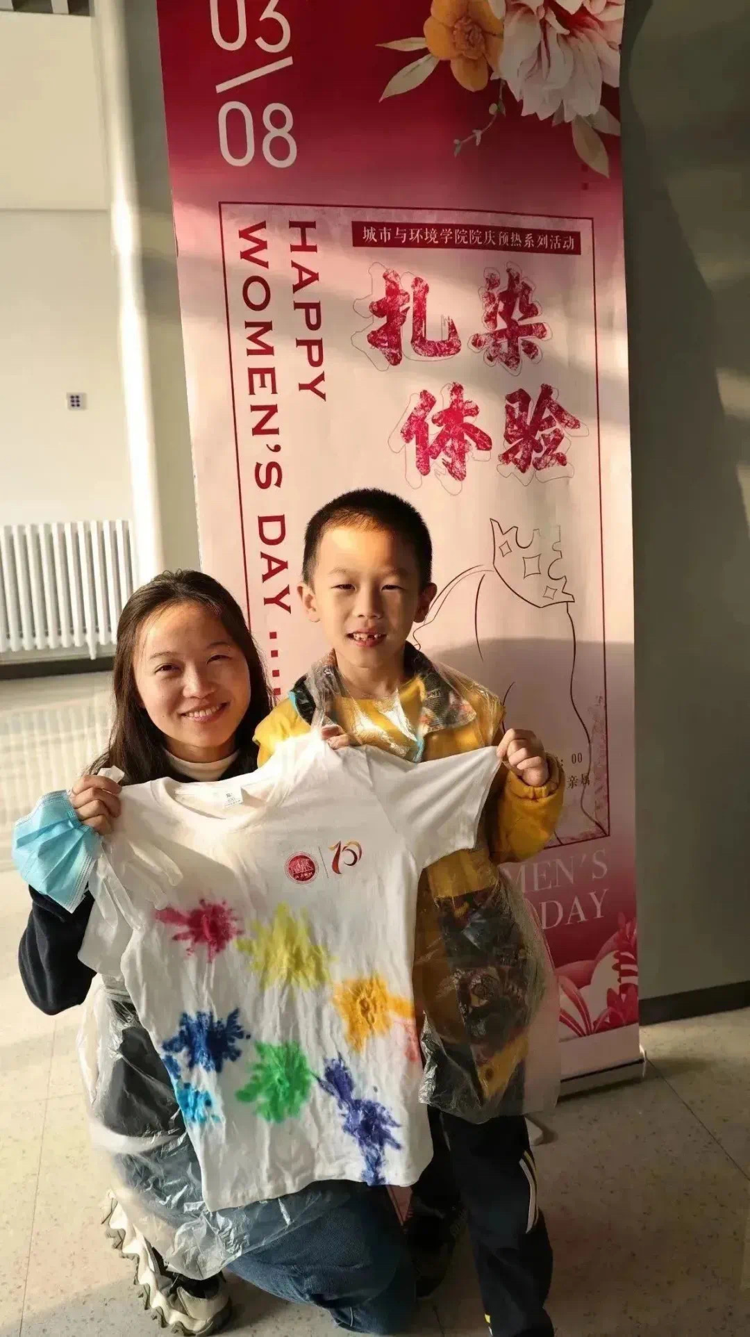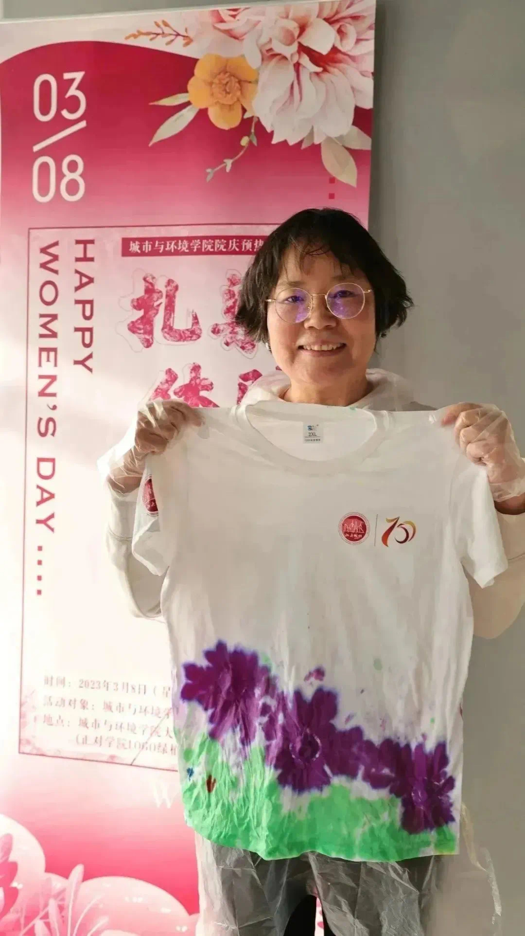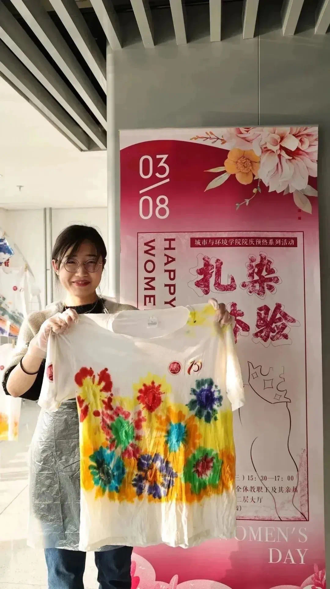 建院15周年献礼。学院党委书记彭建、党委副书记陈耀华、副院长曹广忠和金鑫也来到现场,为参与活动的各位教职工送上节日祝福。 学院领导到场慰问 扎染是中国民间传统的染色工艺,主要分为扎结和染色两部分,通过纱、线、绳等工具,对织物进行扎、缝、缚、缀、夹等多种形式组合后进行染色。经过工作人员的简单介绍,大家迅速掌握了扎染技术的基本方法,迫不及待地投入到作品创作中。 活动现场 妙手生花,巧思尽显。用玻璃弹珠扎结花朵、用皮筋木片旋转捆绑,简单的白色T恤在大家手中被赋予了多姿造型,意想不到的惊喜正在被悄悄创造。 不同扎结方法的作品 耐心晕染、精心点缀,斑斓的色彩在大家的创意组合下呈现出无穷变化。自由豪放的泼墨、简单雅致的渐变、活泼可爱的花卉、自由奔放的火苗……或独自挥毫,或亲子联动,大家全情投入、用心创作,将艺术和美好心情融入一件件匠心独具的扎染作品中。 大家认真创作 固色濯洗,沉淀绚丽。浸泡结束后,一份份“扎染盲盒”被陆续开启。奇妙的扎结工艺让原本简单孤立的色彩渲染拓展为大片如梦如幻的斑斓,碰撞交织的花纹图案让原本无心之举的勾勒也变得如神来之笔一般。接连不断的惊喜让活动现场更加其乐融融,大家相互展示自己满意的作品,赞美之声一时不绝于耳。最后,大家纷纷与自己的作品合影留念,定格这份与扎染邂逅的美好回忆。 大家与自己的扎染作品合影留念 本次活动不仅让大家体验到扎染技艺的独特魅力,促进了教师间的交流,也弘扬了中华民族传统文化、陶冶了大家的艺术情操,使老师们在繁忙的工作中放松身心,同时收获了一份独特作品。 活动合影
