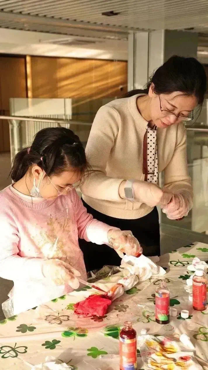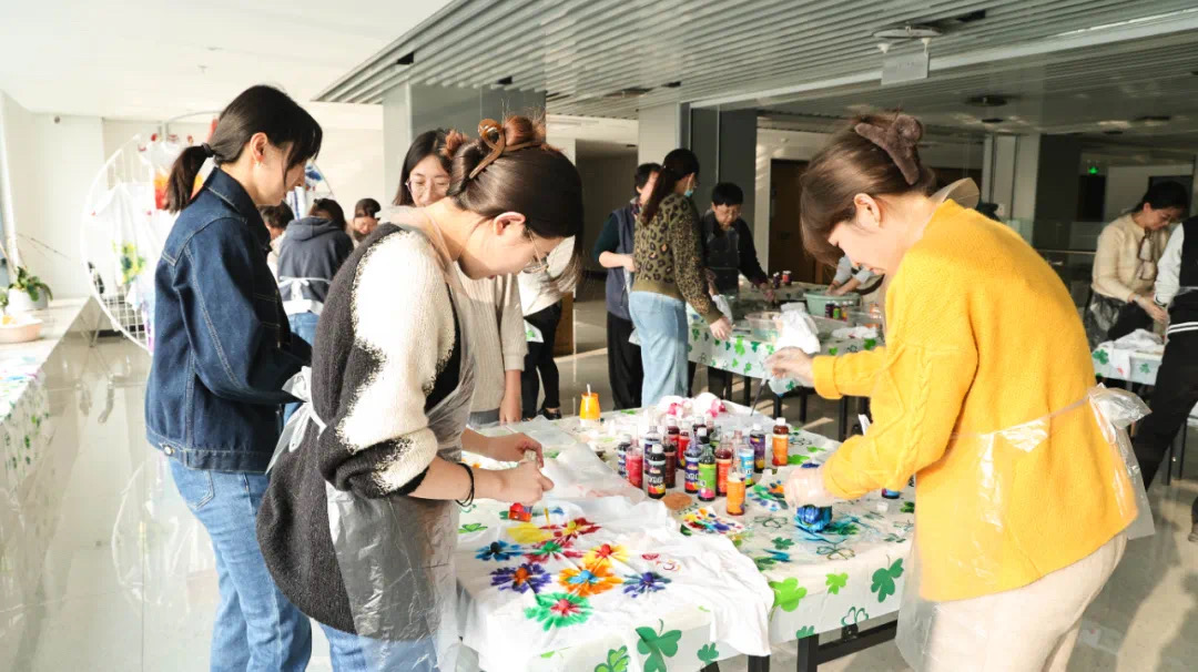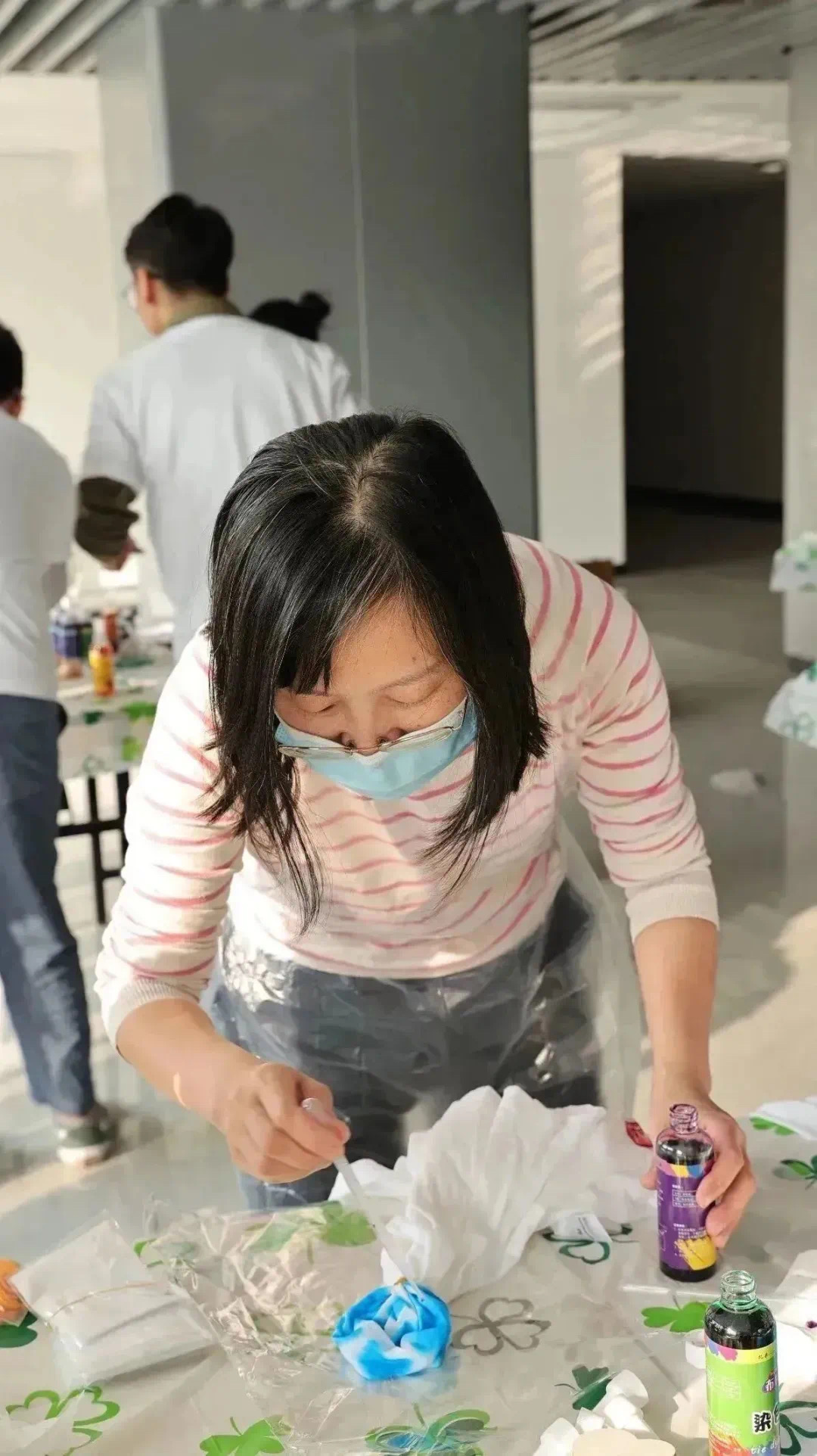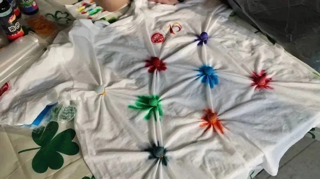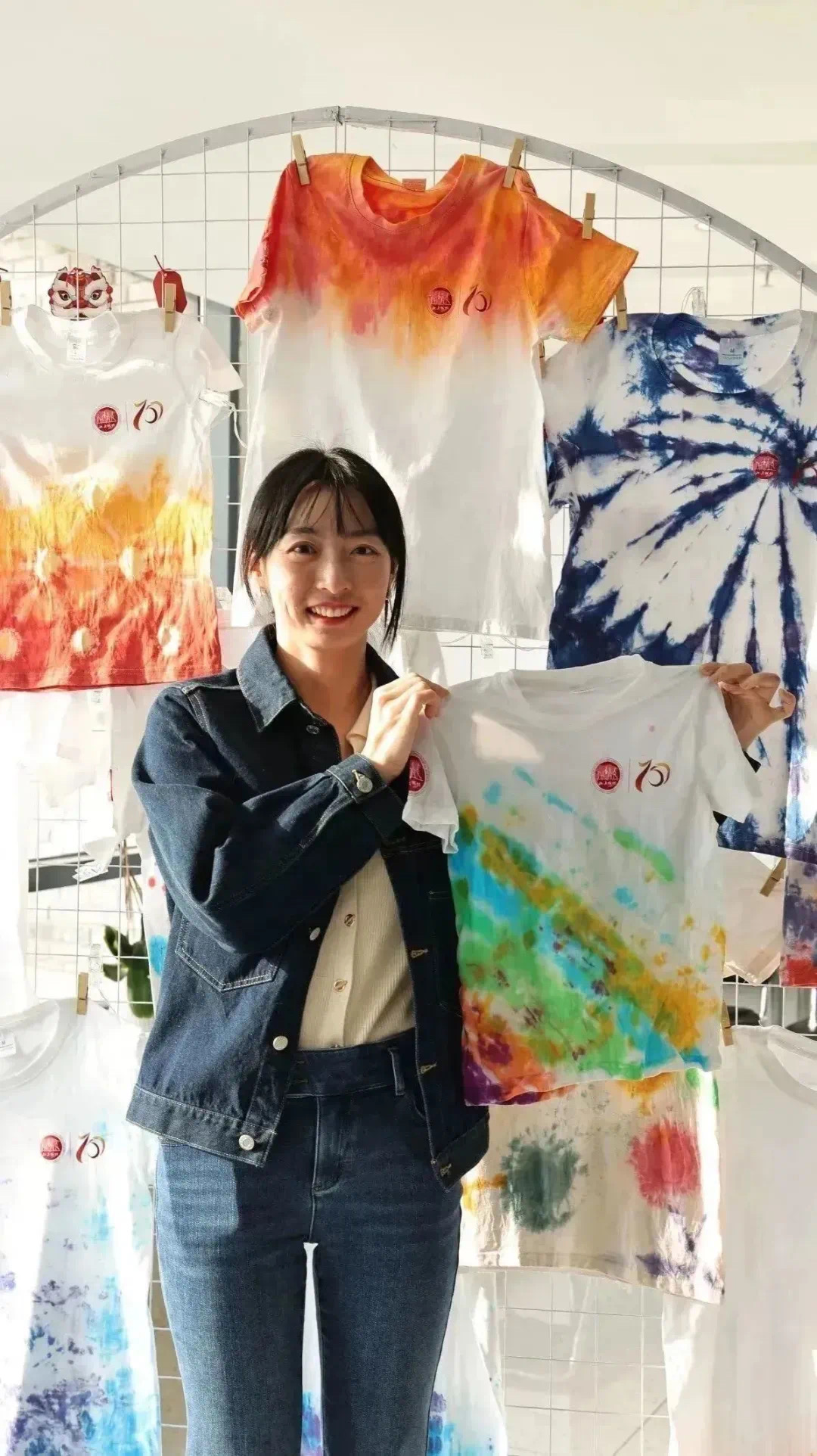 建院15周年献礼。学院党委书记彭建、党委副书记陈耀华、副院长曹广忠和金鑫也来到现场,为参与活动的各位教职工送上节日祝福。 学院领导到场慰问 扎染是中国民间传统的染色工艺,主要分为扎结和染色两部分,通过纱、线、绳等工具,对织物进行扎、缝、缚、缀、夹等多种形式组合后进行染色。经过工作人员的简单介绍,大家迅速掌握了扎染技术的基本方法,迫不及待地投入到作品创作中。 活动现场 妙手生花,巧思尽显。用玻璃弹珠扎结花朵、用皮筋木片旋转捆绑,简单的白色T恤在大家手中被赋予了多姿造型,意想不到的惊喜正在被悄悄创造。 不同扎结方法的作品 耐心晕染、精心点缀,斑斓的色彩在大家的创意组合下呈现出无穷变化。自由豪放的泼墨、简单雅致的渐变、活泼可爱的花卉、自由奔放的火苗……或独自挥毫,或亲子联动,大家全情投入、用心创作,将艺术和美好心情融入一件件匠心独具的扎染作品中。 大家认真创作 固色濯洗,沉淀绚丽。浸泡结束后,一份份“扎染盲盒”被陆续开启。奇妙的扎结工艺让原本简单孤立的色彩渲染拓展为大片如梦如幻的斑斓,碰撞交织的花纹图案让原本无心之举的勾勒也变得如神来之笔一般。接连不断的惊喜让活动现场更加其乐融融,大家相互展示自己满意的作品,赞美之声一时不绝于耳。最后,大家纷纷与自己的作品合影留念,定格这份与扎染邂逅的美好回忆。 大家与自己的扎染作品合影留念 本次活动不仅让大家体验到扎染技艺的独特魅力,促进了教师间的交流,也弘扬了中华民族传统文化、陶冶了大家的艺术情操,使老师们在繁忙的工作中放松身心,同时收获了一份独特作品。 活动合影