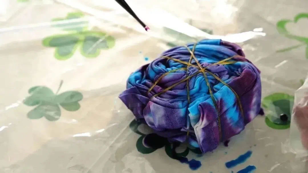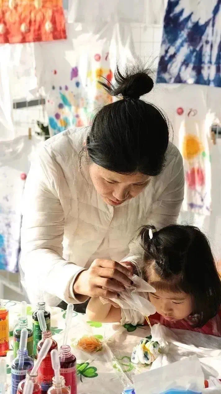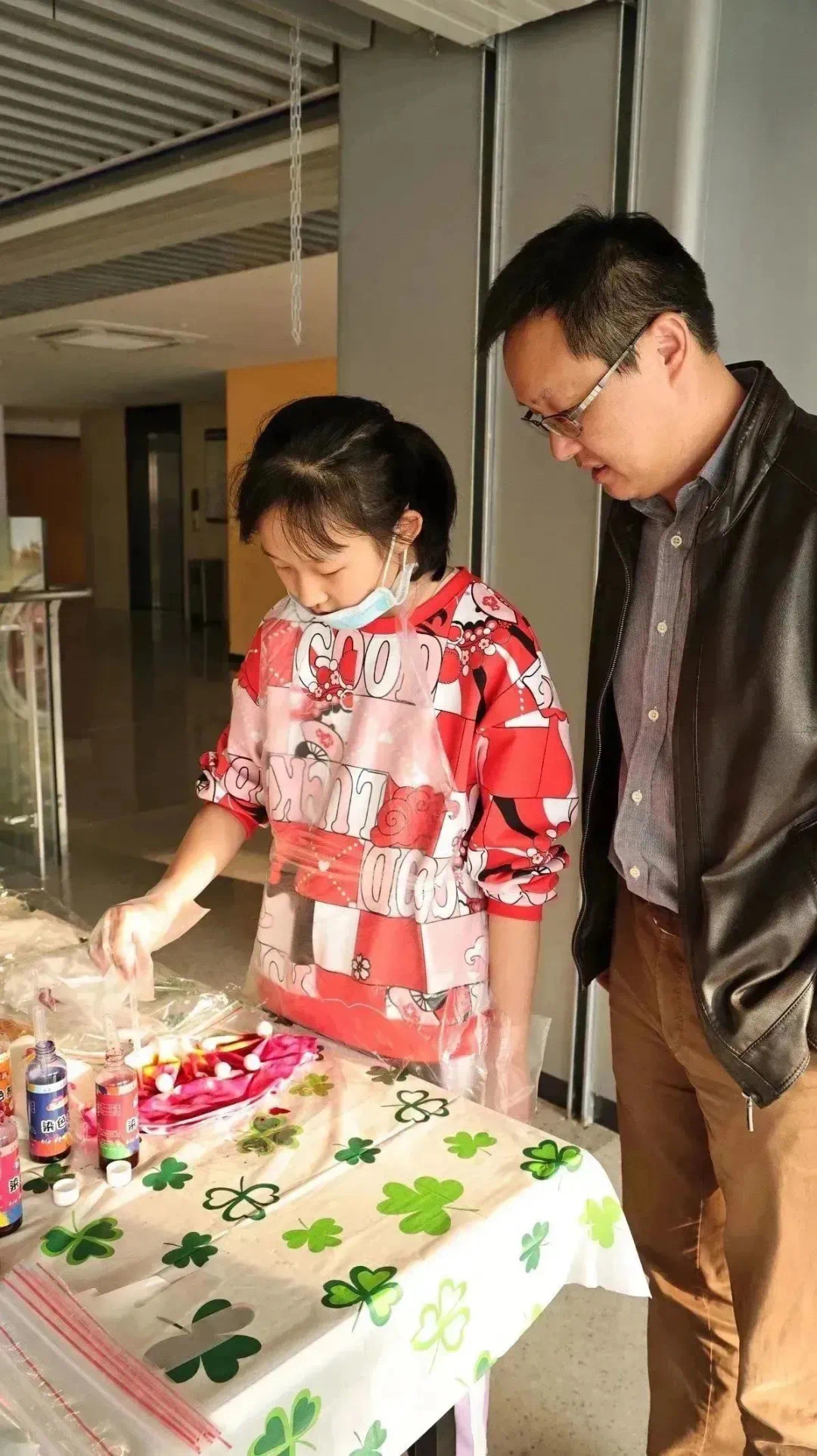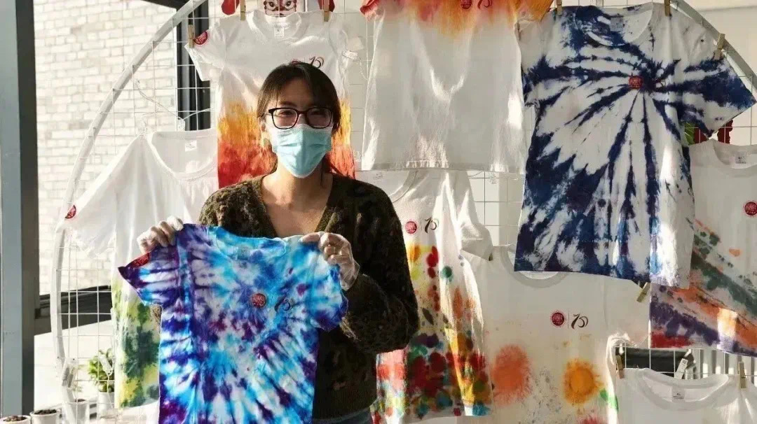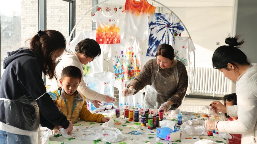 建院15周年献礼。学院党委书记彭建、党委副书记陈耀华、副院长曹广忠和金鑫也来到现场,为参与活动的各位教职工送上节日祝福。 学院领导到场慰问 扎染是中国民间传统的染色工艺,主要分为扎结和染色两部分,通过纱、线、绳等工具,对织物进行扎、缝、缚、缀、夹等多种形式组合后进行染色。经过工作人员的简单介绍,大家迅速掌握了扎染技术的基本方法,迫不及待地投入到作品创作中。 活动现场 妙手生花,巧思尽显。用玻璃弹珠扎结花朵、用皮筋木片旋转捆绑,简单的白色T恤在大家手中被赋予了多姿造型,意想不到的惊喜正在被悄悄创造。 不同扎结方法的作品 耐心晕染、精心点缀,斑斓的色彩在大家的创意组合下呈现出无穷变化。自由豪放的泼墨、简单雅致的渐变、活泼可爱的花卉、自由奔放的火苗……或独自挥毫,或亲子联动,大家全情投入、用心创作,将艺术和美好心情融入一件件匠心独具的扎染作品中。 大家认真创作 固色濯洗,沉淀绚丽。浸泡结束后,一份份“扎染盲盒”被陆续开启。奇妙的扎结工艺让原本简单孤立的色彩渲染拓展为大片如梦如幻的斑斓,碰撞交织的花纹图案让原本无心之举的勾勒也变得如神来之笔一般。接连不断的惊喜让活动现场更加其乐融融,大家相互展示自己满意的作品,赞美之声一时不绝于耳。最后,大家纷纷与自己的作品合影留念,定格这份与扎染邂逅的美好回忆。 大家与自己的扎染作品合影留念 本次活动不仅让大家体验到扎染技艺的独特魅力,促进了教师间的交流,也弘扬了中华民族传统文化、陶冶了大家的艺术情操,使老师们在繁忙的工作中放松身心,同时收获了一份独特作品。 活动合影