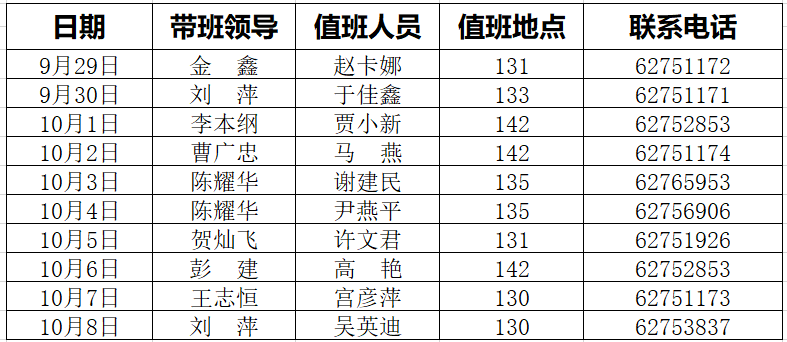 根据学校要求,9月29日至10月8日,学院每日安排1位工作人员在岗值班,值班时间为9:00-16:00,同时每日安排1位领导带班,带班时间9:00-次日9:00,要求带班领导在京并保持手机畅通。