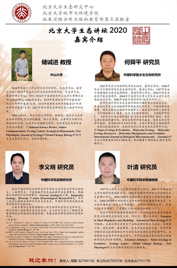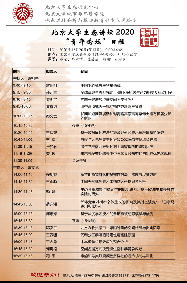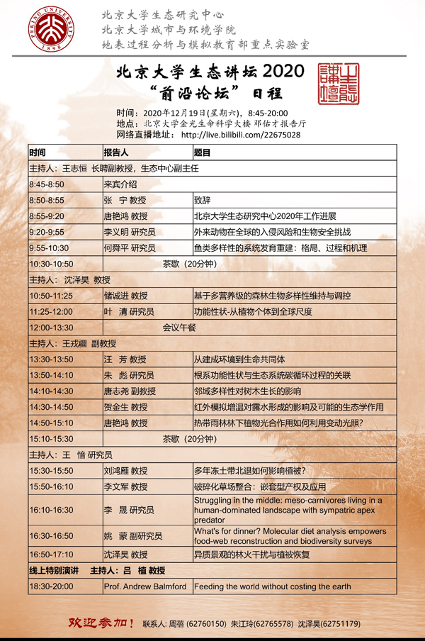 第十七届北京大学“生态讲坛”将于2020年12月19-20日在北京大学举行。“生态讲坛”由北大生态学系创办于2004年,旨在 “聚焦生态学国际前沿热点,关切中国生态环境重大课题”。每次论坛历时2天,特邀国际国内学术大家前沿系列讲座,系统汇报北京大学生态研究中心师生们当年的重要学术进展,已经成为具有国际影响力的生态学年度学术盛宴。会议面向校内外师生以及公众开放,不收取注册费,热烈欢迎各位老师和同学们积极参加。