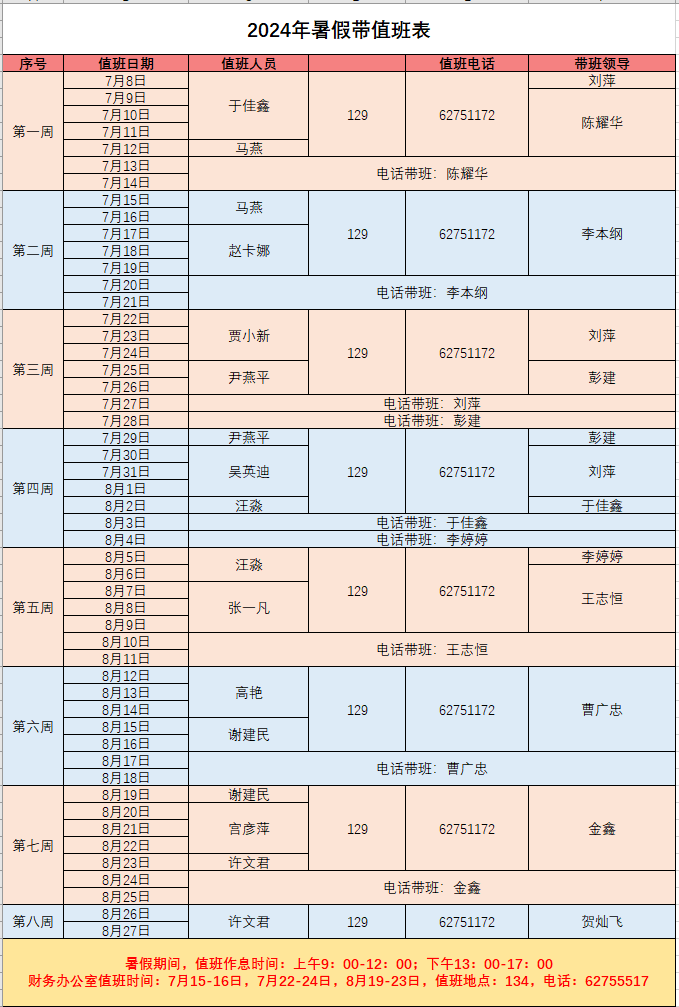 2.学院财务办公室暑假值班日期为:7月15-16日,7月22-24日,8月19-23日,值班地点:134,电话:62755517,值班日对外办公时间为:上午9:00-11:30,下午13:00-16:30。如需办理财务事宜请在以上时间尽快办理。