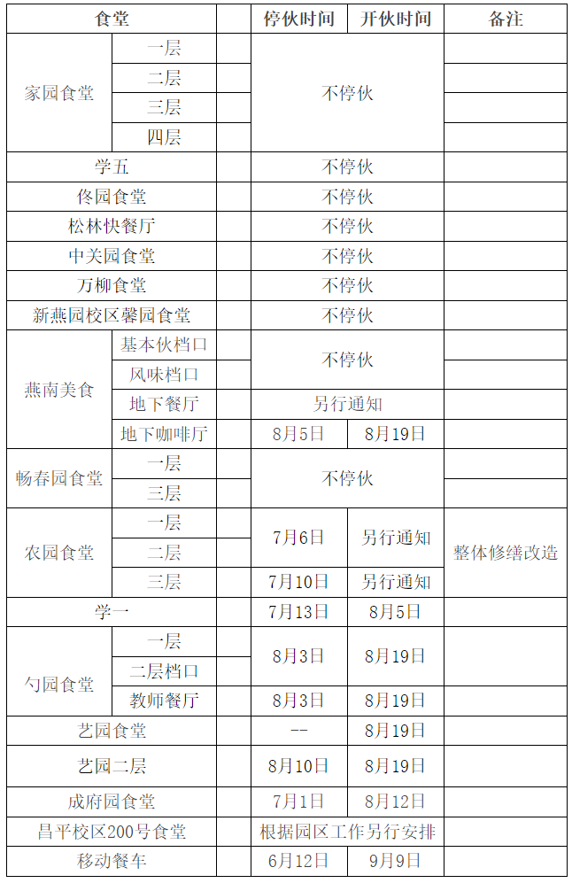 三、假期各食堂开放时间