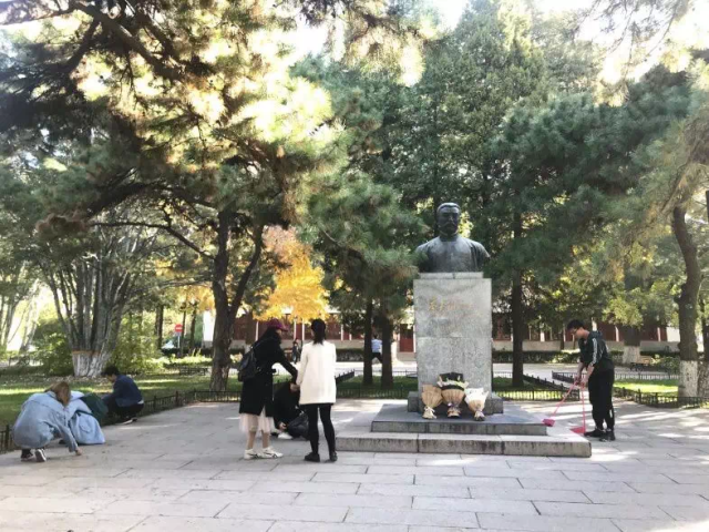 2019年10月31日上午,支部成员前往静园草坪祭扫革命烈士纪念碑和李大钊先生铜像。北京大学革命烈士纪念碑呈“心”字型,坐落于燕园的静园草坪北侧,由几块红色大理石组成。纪念碑于1993年5月4日揭幕,纪念从1919年“五四”运动到新民主主义革命取得全国胜利期间,为中国的民族解放和人民革命事业英勇献身的北京大学83位师生。其旁矗立的李大钊先生铜像由北大七七、七八两届毕业生怀念敬立,以纪念这位我国共产主义的先驱、伟大的马克思主义者。