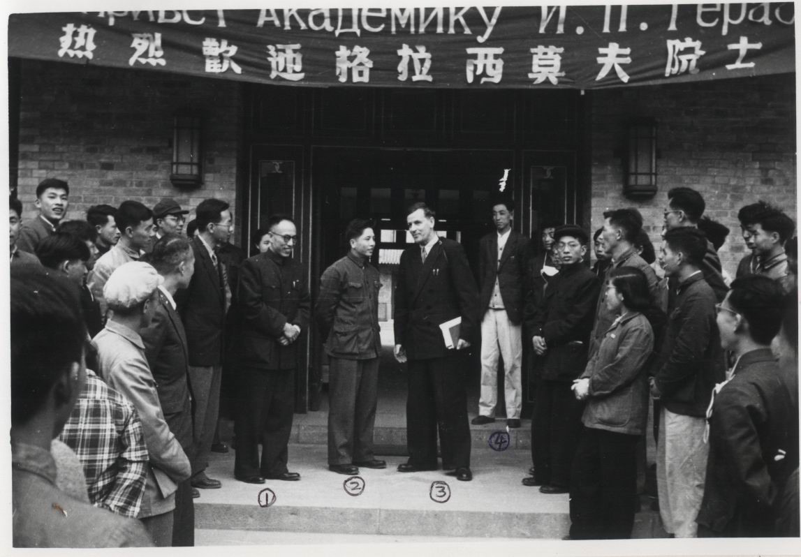老地学楼门口地质地理系师生欢迎苏联科学院地理研究所所长格拉西莫夫院士(1955年)