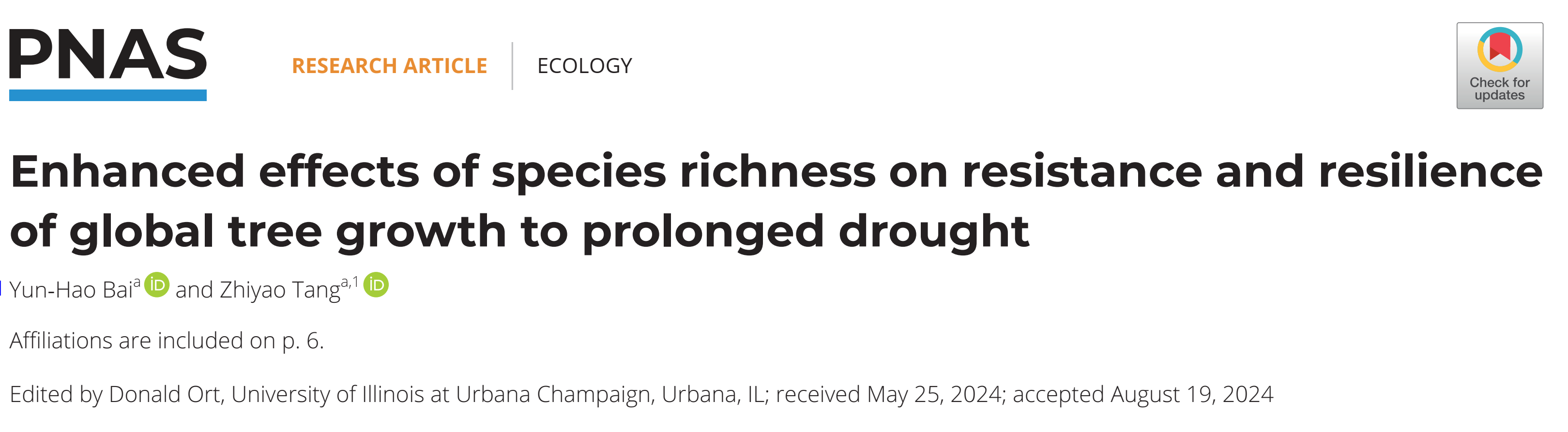 该成果近期以“Enhanced effects of species richness on resistance and resilience of global tree growth to prolonged drought”为题发表于《美国科学院院刊》(PNAS)杂志(论文链接://doi.org/10.1073/pnas.2410467121)。2023级博士研究生白云昊为论文第一作者,唐志尧教授为论文通讯作者。研究受到国家重点研发计划(2022YFF0801801)和国家自然科学基金(32025025,31988102)资助。