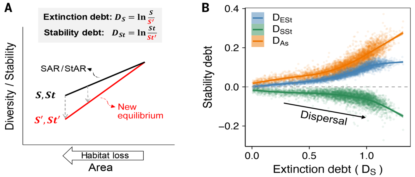 图3. 生境破坏会引起物种多样性(S)与生态系统稳定性(St)下降。由于群落达到新的平衡需要较长时间,因此物种数和稳定性的下降会在一段时间内持续进行,引发灭绝债务(extinction debt)和稳定性债务(stability debt)。通常,灭绝债务越大,则稳定性债务越大