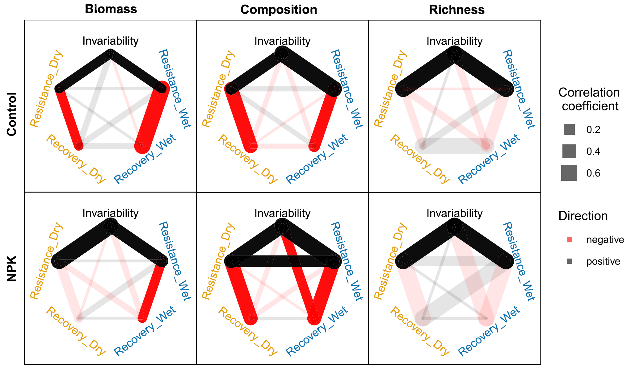 图 2.对照和营养添加(NPK)条件下不同稳定性指标之间的相关性。