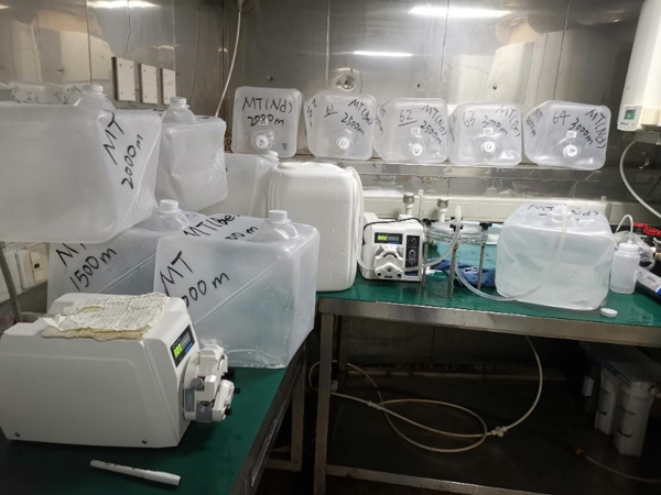 “初站”海沟的第一个夜晚是一个不眠的夜晚,也是收获的夜晚,并肩“作站”,“初站”告捷。“初站”的晚上并不是只有北大四人小组在挑灯夜战,战友们还有中国科学院海洋研究所多个课题组,以及来自其他单位的各位好汉。从后甲板至船舱最前部的过滤室中间隔着4道门槛,平板推车等设备完全无法施展,装有20L海水的大桶只能仰赖人力运输,道道门槛道道关,若不是有各位好汉相助,只怕过滤还没开始,大家就早已累瘫。同舟之情,心怀感激,感恩那天和那之后每一个不眠站位的鼎力相助。