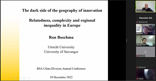 荷兰乌得勒支大学Ron Boschma教授介绍了相关多样化发展与区域不平等的最新成果。他的团队使用产业和专利数据,分析了欧洲32个国家283个地区过去15年的区域演化格局。研究发现只有经济最发达的地区才有机会从事高度复杂的活动。这些区域倾向于关注相关的高复杂度活动,而落后区域则专注于相关的低复杂度活动,从而形成空间不平等的反馈循环。报告结束后,Boschma教授就各位与会者提出的落后地区如何跳出路径依赖、模型的内生性、颠覆性技术的影响、多维产业关联的拓展等问题与在线听众进行深入交流。