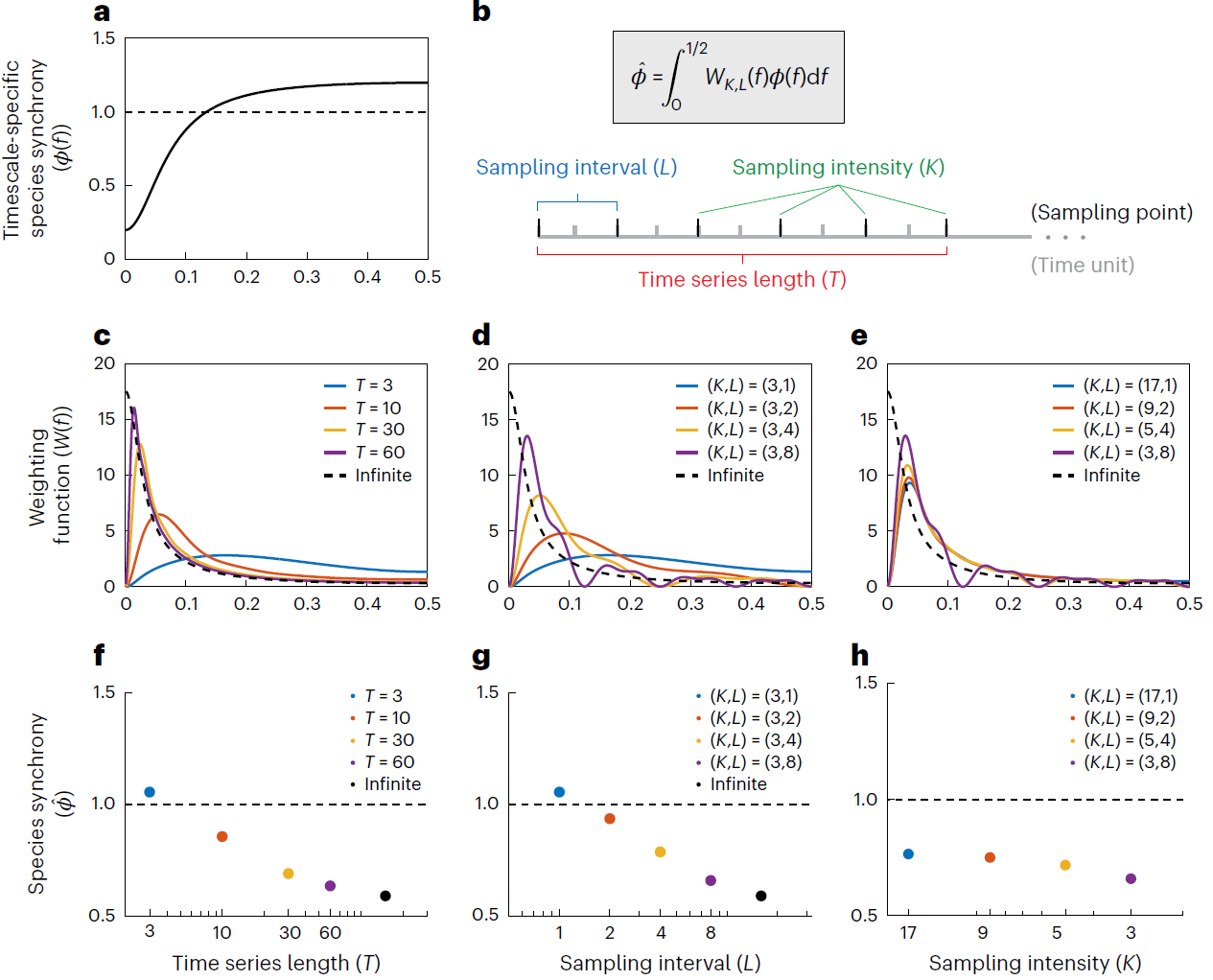2025年7月1日,北京大学香港六合彩开奖直播 王少鹏研究组在《自然•生态与进化》(Nature Ecology & Evolution)在线发表了题为 “Short time series obscure compensatory dynamics in ecological communities”的研究论文。通过结合时间序列谱分析、群落动态模型和经验数据,该研究深入解析了时间序列长度对物种同步性及其与物种多样性关系的影响。首先,基于平稳过程的谱分析方法,推导了有限时间序列中物种同步性的期望表达式。在此基础上,通过分析竞争模型和植物群落观测数据,评估了物种同步性及其与多样性的关系如何依赖于时间序列长度。结果发现,虽然竞争在长时间尺度上降低物种同步性,但其在短时间尺度上可增加同步性,这导致物种同步性随时间序列长度增加而下降(图1)。进一步分析发现,物种同步性与多样性的关系在不同长度的时间序列中可能表现出相反的模式:在长时间序列中,物种同步性随多样性增加而降低;而在短时间序列中,同步性却随多样性增加而上升(图2)。