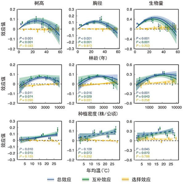 图3. 混交林的增产效应随林龄、种植密度和温度的变化