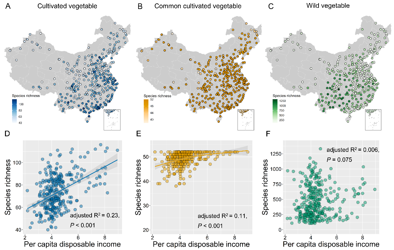 团队调查记录了我国330个城市中近3000家超市售卖的蔬菜物种和销量数据,同时构建了一个包含2461种野生蔬菜的综合数据库。结果发现,市场上售卖的栽培蔬菜有164种,物种多样性低于预期。市场中52种常见栽培蔬菜贡献了超过95%的销量(图1A)。总体上,较富裕的地区栽培蔬菜多样性更高,主要由于供应了更多价格较高的稀有栽培蔬菜所致。尽管如此,常见栽培蔬菜在全国范围供应十分均衡,过去几十年实施的菜篮子工程在很大程度上确保了不同地区的居民都能够公平的获取这些蔬菜资源(图2A)。然而,过度依赖少数常见栽培蔬菜可能增加蔬菜饮食趋于同质化的风险。