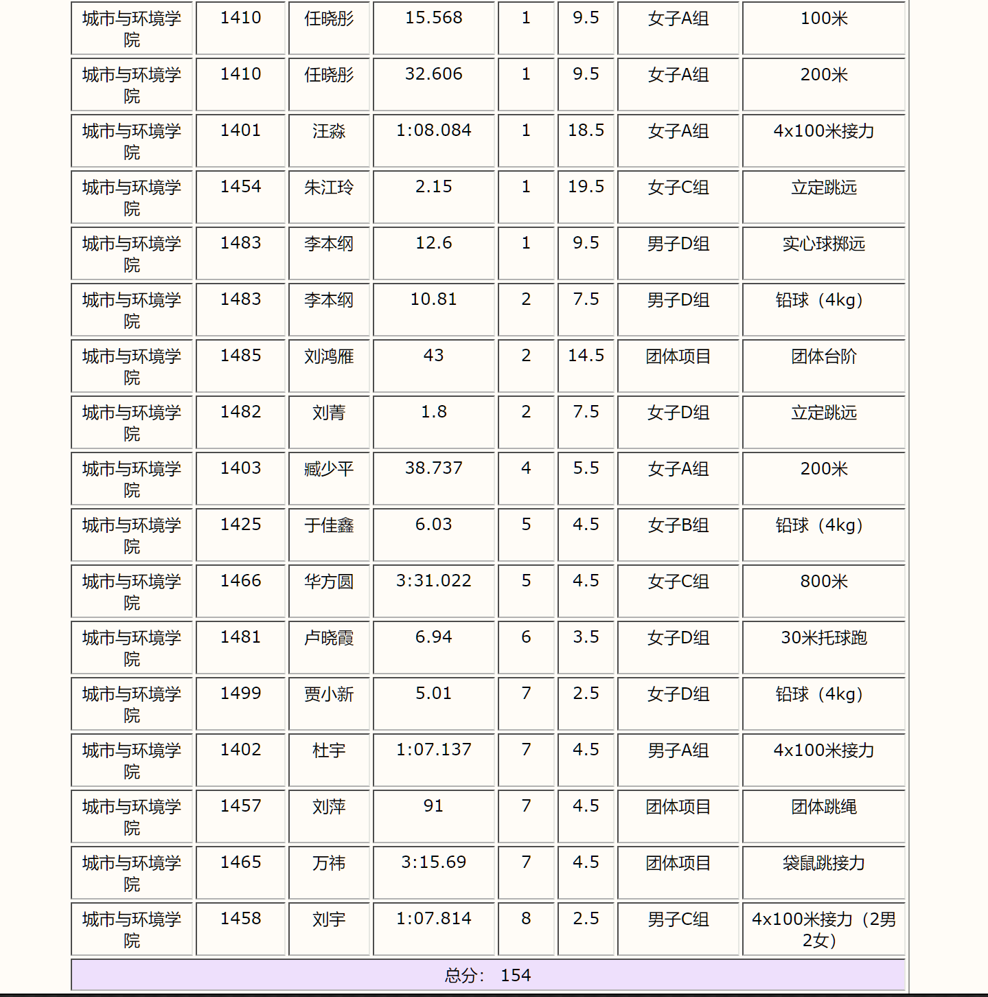 本次运动会中,多位教师取得个人单项比赛好成绩,其中朱江玲老师打破了女子C组立定跳远项目的校记录,李本纲老师取得男子D组实心球项目第一名和男子D组铅球第二名,任晓彤老师取得女子A组100米和200米的第一名,女子A组接力队伍取得第一名,刘菁老师取得女子D组立定跳远第二名,充分展示了香港六合彩开奖直播 教工代表队成员们出类拔萃的个人实力。