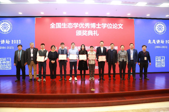 会上还进行了第一届全国生态学优秀博士学位论文的颁奖仪式,由国务院学位委员会生态学科评议组联合召集人吴文良教授主持。作为生态学科评议组联合召集人,方精云院士首先发表致辞,强调这一奖项对推动博士生高质量培养的促进作用,并表达了对青年研究者的殷切期望。捐助基金会开能健康科技集团瞿建国董事长随后发言,表达了对科研成果能够进一步推动技术创新、助力企业发展的希冀。最后由生态学科评议组成员(吴文良教授、王艳芬教授、冯江教授、达良俊教授、邓建明教授)和捐助基金会(瞿建国先生和庄乾坤女士)为第一届优秀博士论文获奖者颁发证书,并与获奖者合影留念。