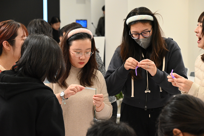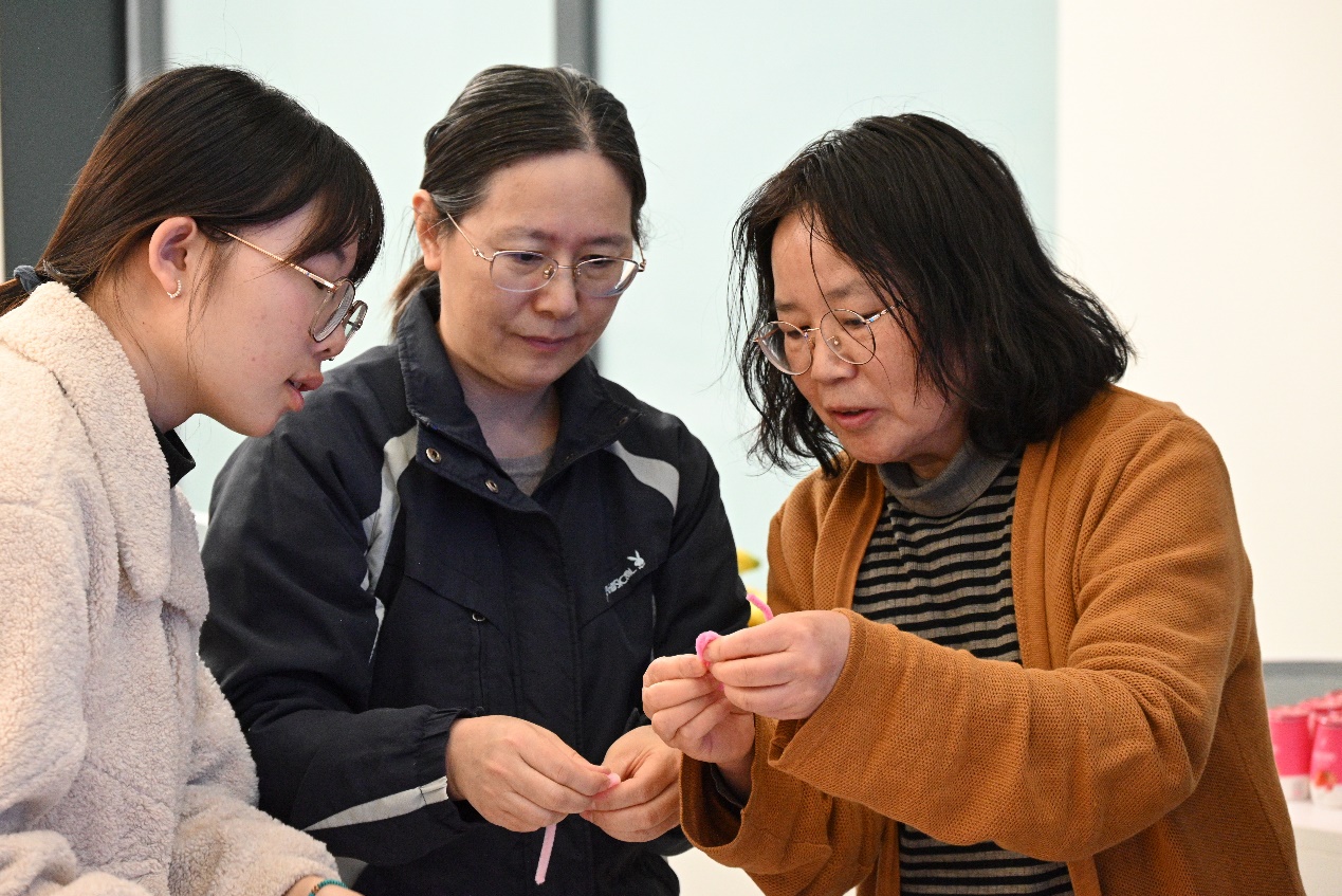 创意手工活动的现场则是另一番热闹景象。轻音乐缓缓流淌,营造出一种温馨而惬意的氛围。桌子上摆着五彩缤纷的扭扭棒、大大小小的杯垫、闪闪亮亮的装饰物……老师们忙碌的身影此起彼伏。她们或低头专注于手中的材料,用灵巧的手指编织,将一根根彩色的扭扭棒变成可爱的花瓣;或三五成群地聚在一起,热烈讨论着设计思路,互相启发,互相学习。空气中弥漫着淡淡的花香和胶水的味道,与老师们欢快的笑声交织在一起,宛如一首动人的乐章,让人陶醉其中。