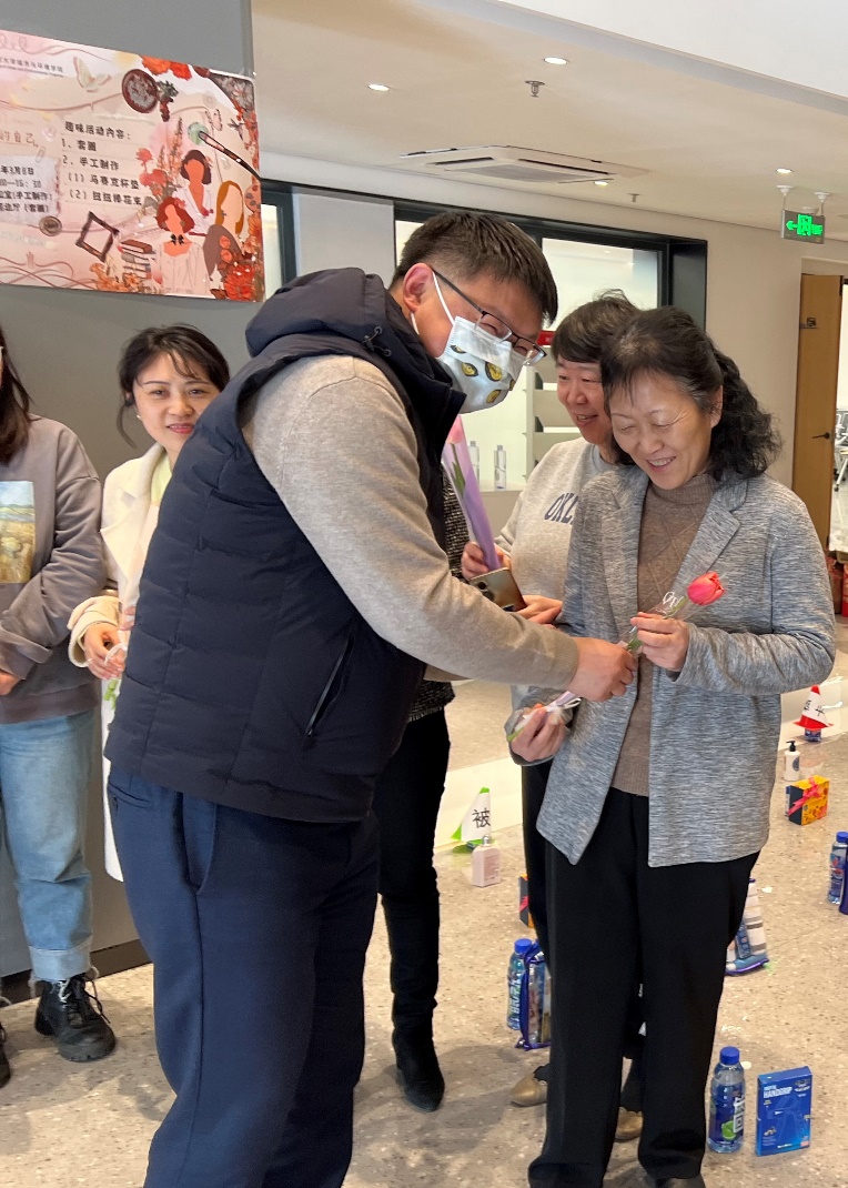 学院男教师为现场女教师送上祝福花束