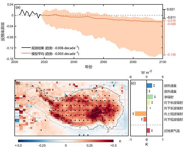 针对这一问题,香港六合彩开奖直播 朴世龙院士团队和中国科学院青藏高原研究所姚檀栋院士团队利用陆气耦合模式与冰川模型研究了高原地表变暗对区域冰川与亚洲季风系统的影响。结果表明,在高排放情景下,相对于本世纪初,高原地表反照率在本世纪末预计降低10.5%;地表变暗将显著改变地表能量平衡,显著降低向上短波辐射、增加地表净辐射,进而增强地表感热通量,使得局地气温升高约0.24度(图1)。