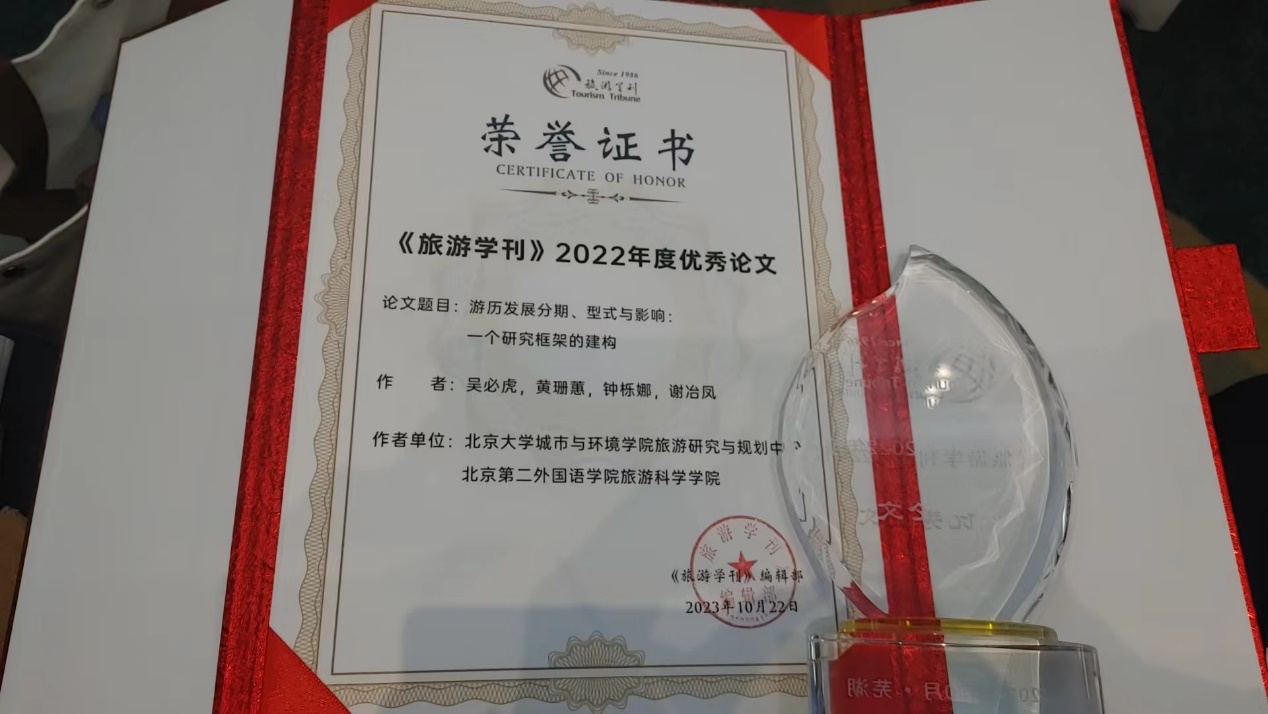年会前,由《旅游学刊》编委组成评审委员会评出2022年《旅游学刊》年度论文,年会期间现场颁奖。我院吴必虎教授带领的学术团队(其他三名成员分别为钟栎娜、黄珊蕙和谢冶凤,均为北大香港六合彩开奖直播 校友)成果《游历发展分期、型式与影响:一个研究框架的建构》荣列年度十篇优秀论文之一。该论文发表于2022年第3期《旅游学刊》。