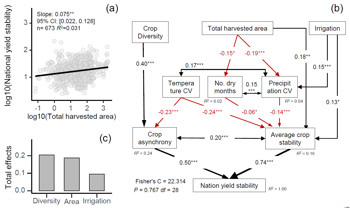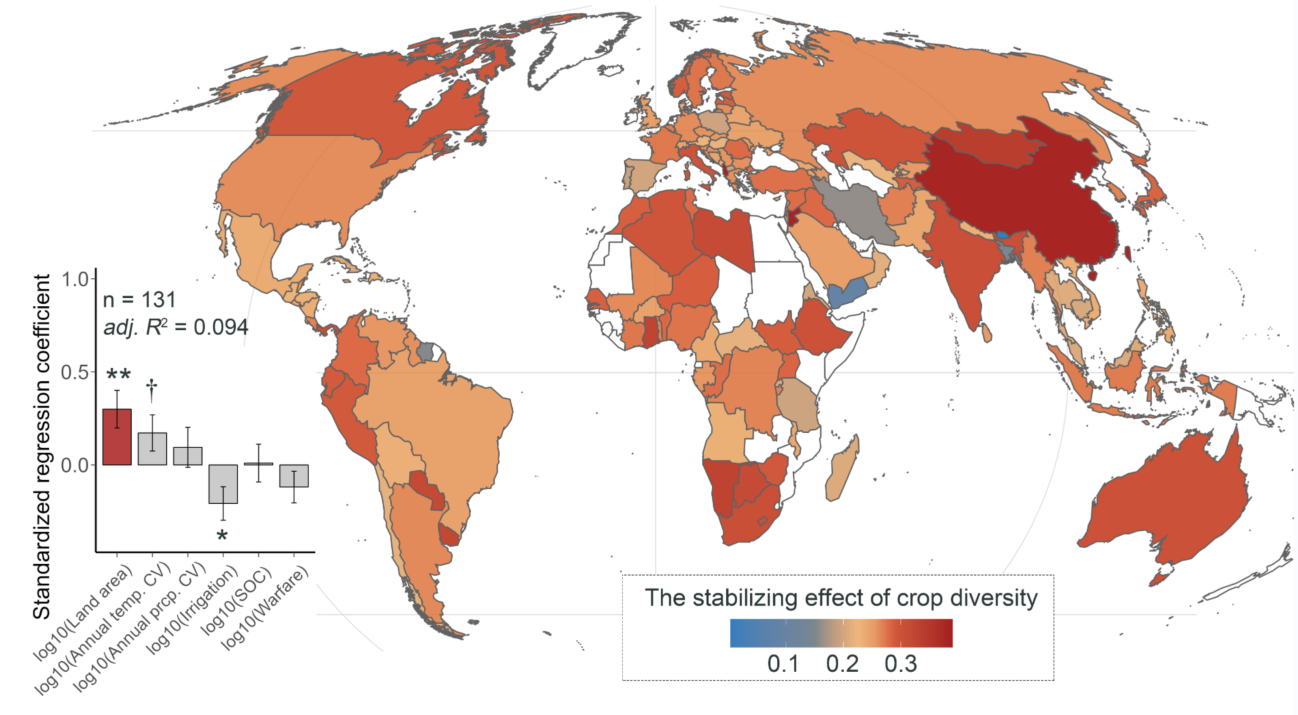 在全球气候变化背景下,粮食安全与产量稳定性成为管理者和科学家共同关注的问题。近期研究表明,作物组合的多样化有利于增强国家水平粮食产量的稳定性1,2。但关于作物多样性的稳定化效应的强度及其普适性仍存在较大争议。近期生态学研究发现多样性和稳定性都具有空间尺度依赖性3,二者关系的强度也随空间尺度增大而增强4。类似地,作物多样性和稳定性也可能呈现尺度依赖,也即面积较大的国家包含更高的作物多样性和稳定性,这可能引起国家水平的作物多样性与粮食产量稳定性呈假相关。另外,作物多样性的稳定化效应也可能取决于国家面积大小。这些因素都为评估作物多样性与产量稳定性的关系引入不确定性。