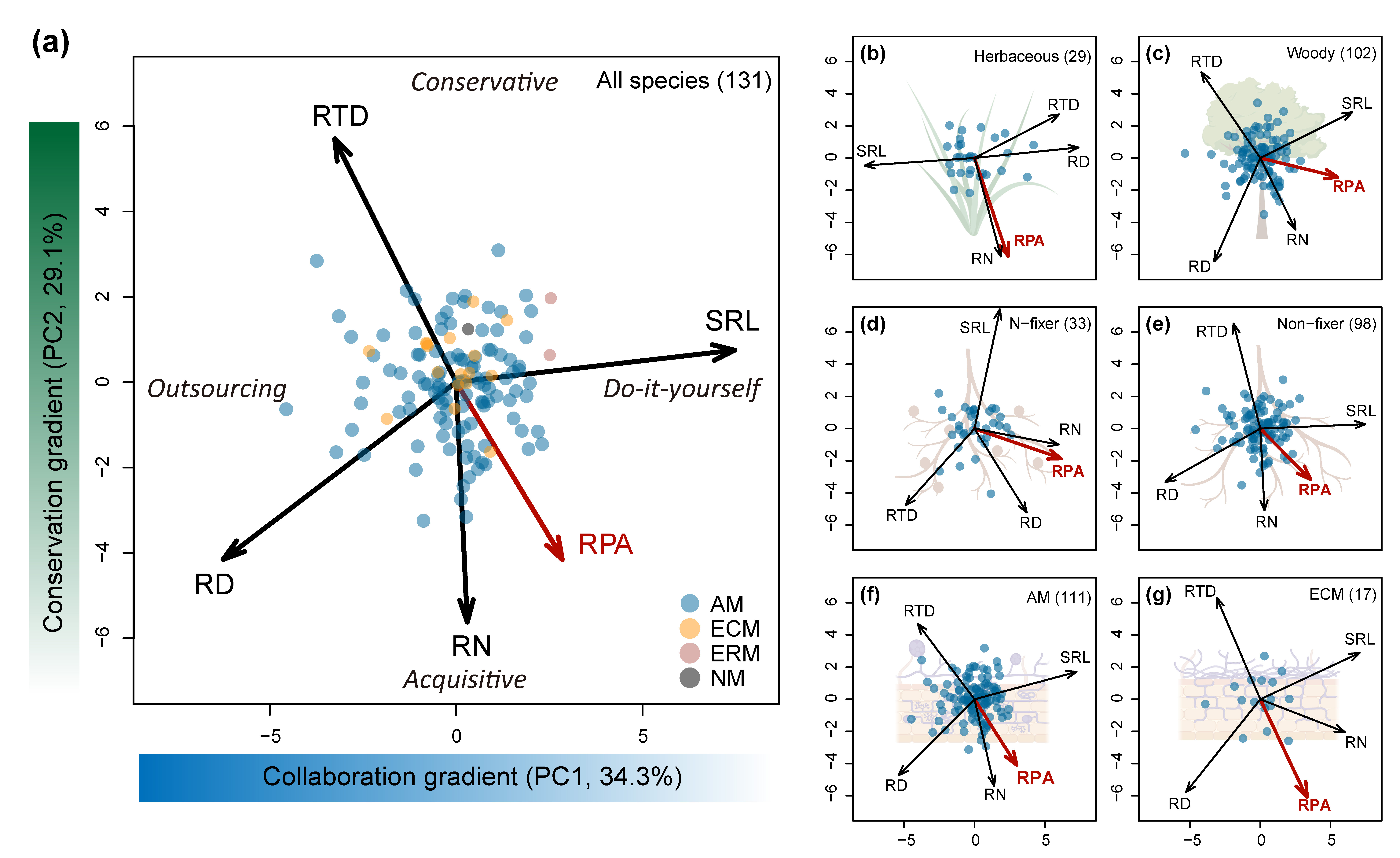 通过全球数据整合分析,揭示了植物细根磷酸酶活性在功能群之间的差异及其与其他细根形态和化学性状的联系(图5)。本研究提供了以下关键启示:(1)植物细根氮-磷获取能力紧密耦合;(2)细根磷酸酶活性主要位于二维细根经济空间的获取维度;(3)植物在分泌细根磷酸酶的生理策略和适应性改变细根结构的形态策略之间进行协调与权衡,平衡碳投资与磷养分收益;(4)植物细根磷酸酶活性能反映细根磷限制状态。这些结果为理解植物细根性状和磷获取功能提供了深入见解,并为改进植物-土壤反馈模型提供了数据支撑。